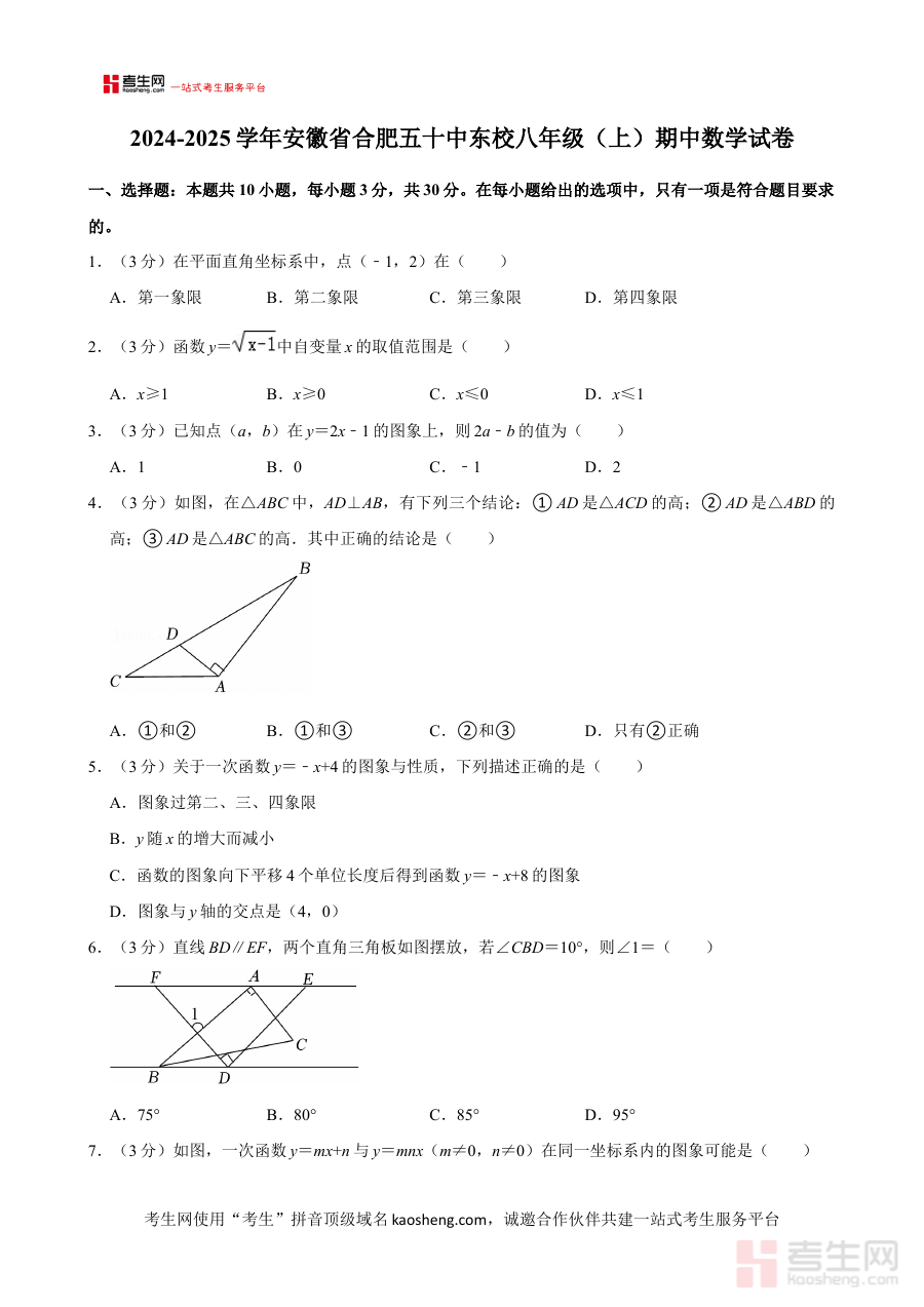 该资料主要适用于安徽省合肥市第五十中学东校2024-2025学年八年级的学生,他们可通过这份试卷进行期中前的模拟检测与系统复习准备,提前熟悉本校期中数学考试的考查模式与节奏,提升应对期中考试的信心与能力;同时同地区其他学校的八年级学生及数学教师也可参考这份资料,了解合肥市初中数学期中考查的部分趋势与该校的教学特色,为自身的学习或教学工作提供有益参考,进一步优化阶段性学习与教学效果。