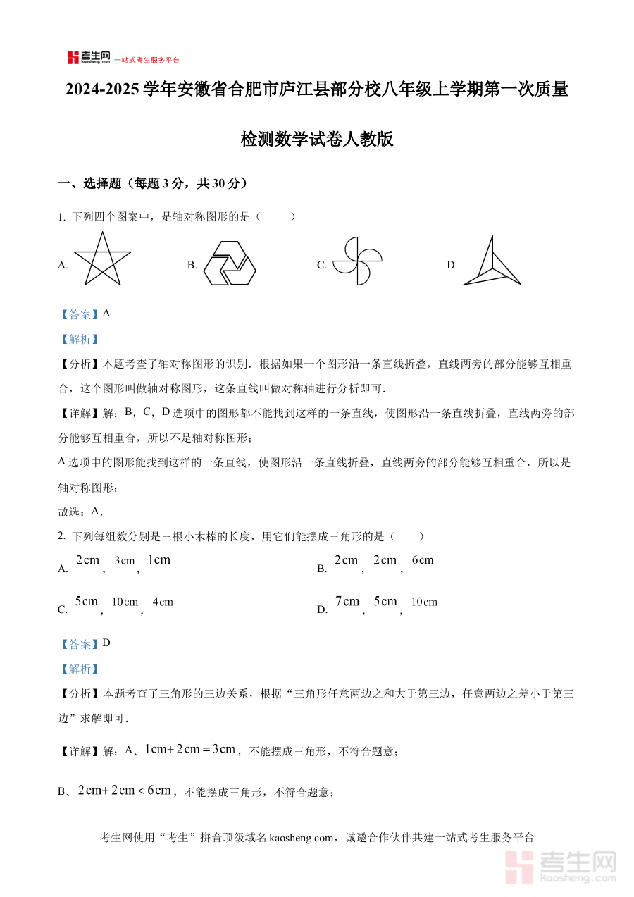 《精品解析:安徽省合肥市庐江县部分校2024-2025学年八年级上学期第一次质量检测数学试卷(人教版)(解析版)》是针对安徽省合肥市庐江县部分学校在2024-2025学年八年级上学期开展的第一次质量检测数学科目的配套解析资料。该资料聚焦本学年八年级上学期初期的数学学习成果检测场景,精准匹配人教版教材体系框架,为相关师生提供了与本地校际质量检测直接对应的备考支持资源。作为阶段性检测的解析版本,它能够帮助使用者快速把握本次质量检测的考查方向与核心目标,是衔接八年级上学期前期学习与后续知识巩固提升的重要参考材料。