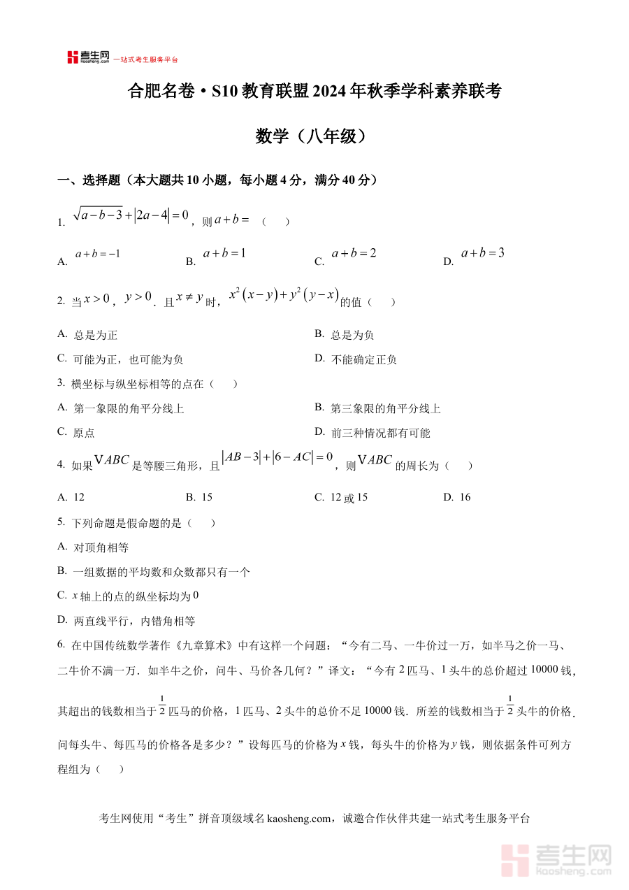 《精品解析:安徽省合肥名卷教育联盟2024-2025学年上学期八年级数学联考试卷(原卷版)》是针对安徽省合肥市名卷教育联盟在2024-2025学年上学期组织的八年级数学联考所编制的原卷类备考资料,明确对应特定区域、特定学年段及特定学科的联考场景,为使用者提供与本次实际考试形式高度一致的试卷资源,帮助使用者提前熟悉联考的整体框架与呈现形式,确保获取的备考素材与考试实际需求紧密贴合。