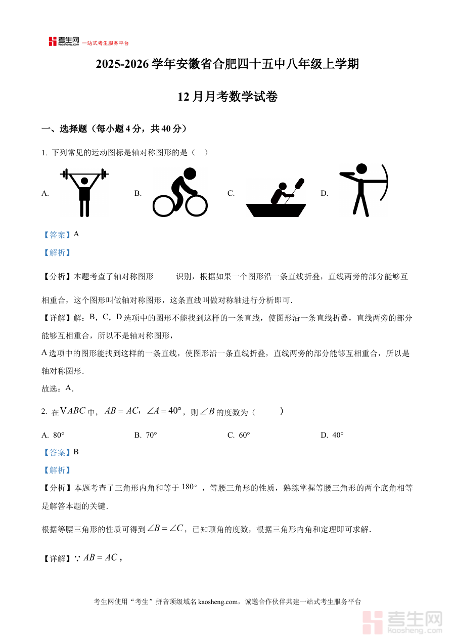 《精品解析:安徽省合肥四十五中2025-2026学年八年级上学期12月月考数学试卷(解析版)》是针对安徽省合肥市第四十五中学2025-2026学年八年级上学期12月月度阶段性考试打造的数学学科配套解析资料。该资料精准匹配该校该学年该阶段的数学学习进度与月考命题导向,为学生提供与本校实际考试高度契合的备考支持,帮助使用者提前熟悉考试的整体结构与考查范围,是贴合该校八年级学生数学阶段性学习需求的重要备考资源。