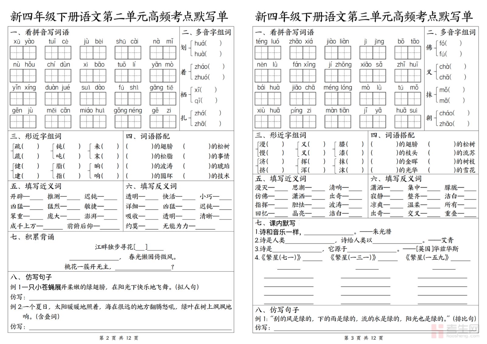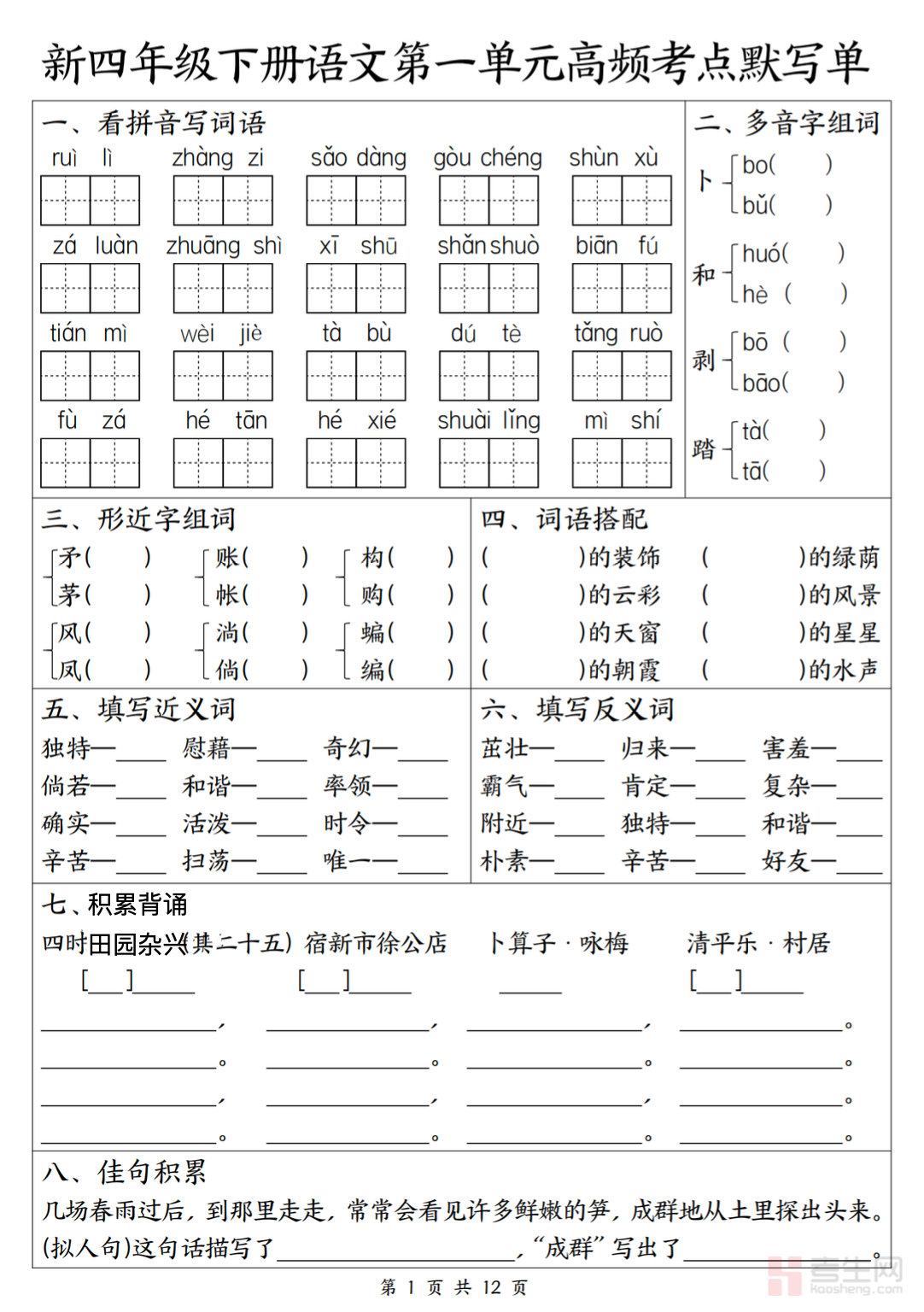 小学语文 1-4 单元高频考点默写单(四年级下)紧扣部编版四年级下册语文教材及期中前教学重点,系统梳理课文重点句段、必背古诗词、日积月累、重点生字词、优美语句、课文中心句等高频默写内容,按 1-4 单元科学编排,考点清晰、重点突出,贴合单元测试与期中检测考情。每份默写单聚焦常考字词、易错字、必背段落,帮助学生扎实夯实语文基础,强化规范书写、记忆背诵、语句理解,有效减少默写失分。适合四年级学生单元复习、课前预习、期中备考、日常巩固,快速提升语文基础与应试能力。请添加微信 18617049513 进专属群,获取更多免费资源!