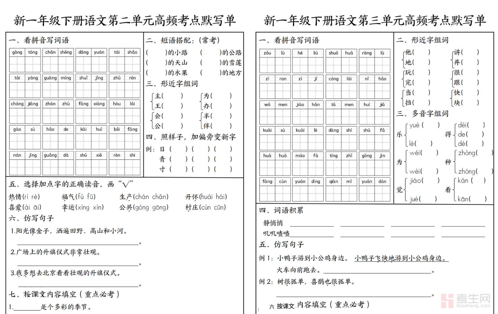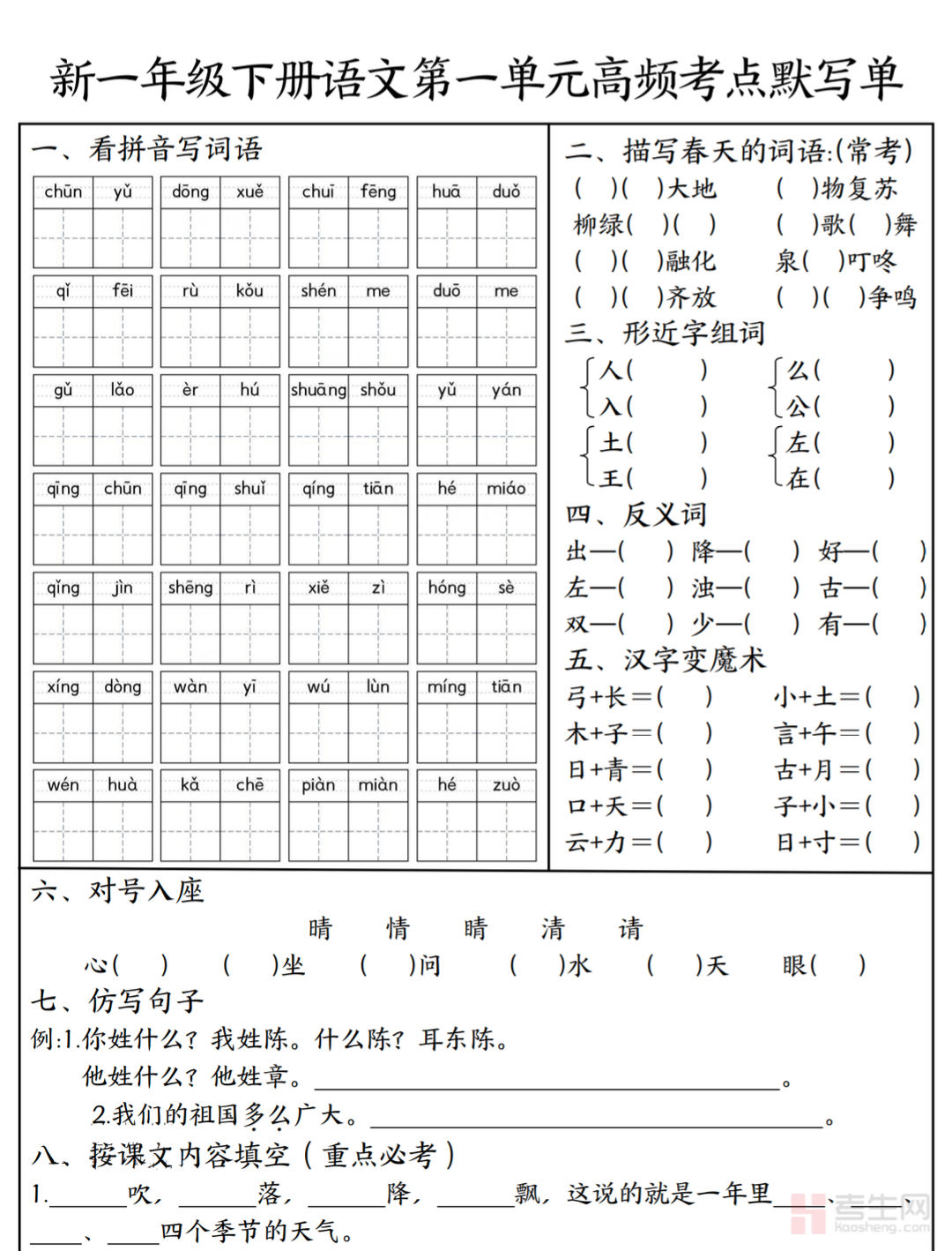 小学语文 1-4 单元高频考点默写单(一年级下)紧扣部编版一年级下册语文教材及单元教学重点,系统梳理必会生字、重点词语、简单句子、必背古诗、课文短句、易错笔画与字词等高频默写内容,按 1-4 单元科学编排,考点清晰、重点突出,贴合低年级单元测试与期中检测考情。默写单侧重识字写字、规范书写、拼音巩固、简单语句积累,内容简单易懂、实用性强,帮助孩子扎实打好语文基础,减少书写与背诵失分,适合一年级学生单元复习、课前预习、期中备考、日常巩固,快速提升语文基础能力与应试水平。请添加微信 18617049513 进专属群,获取更多免费资源!