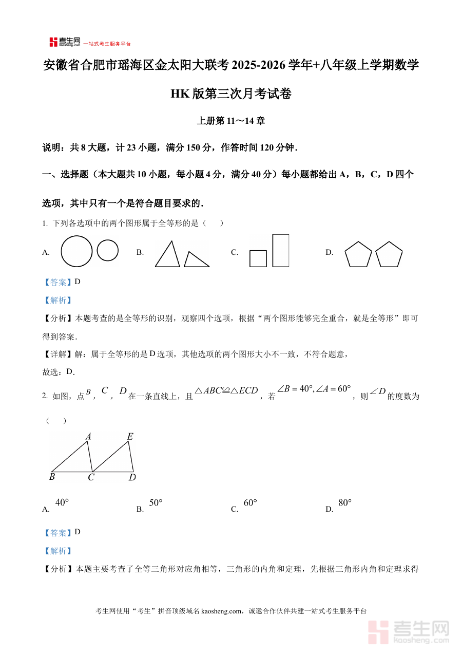 《精品解析:安徽省合肥市瑶海区金太阳大联考2025-2026学年 八年级上学期数学HK版第三次月考试卷(解析版)》是针对安徽省合肥市瑶海区2025-2026学年八年级上学期数学学科HK版教材的金太阳大联考第三次月考配套备考资料。该资料聚焦区域内阶段性联考的考查需求,依托本地教学进度与命题特点,为使用者提供与考试场景高度匹配的解析内容,是了解该区域八年级数学阶段性考试方向、把握考点分布的重要参考资源。