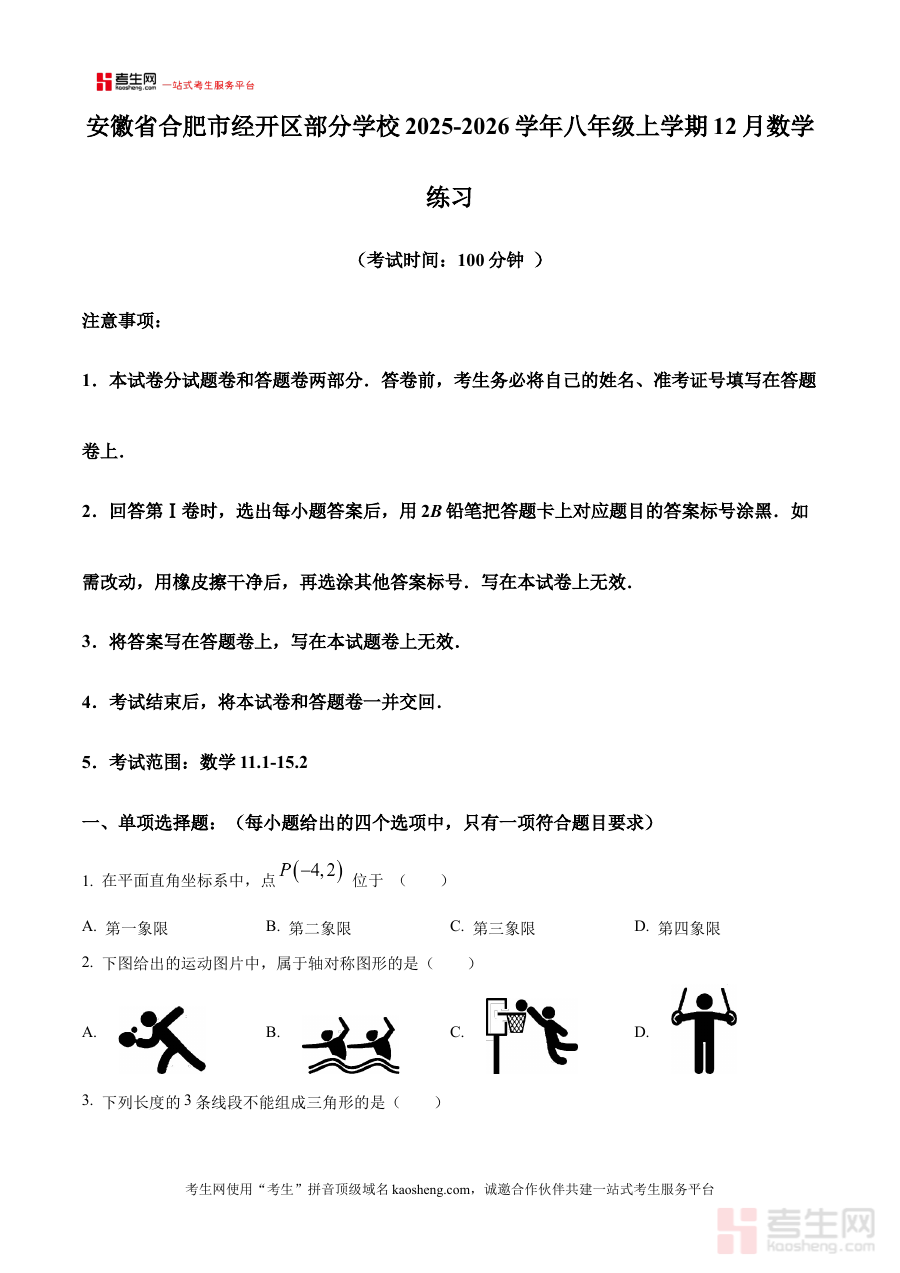 《精品解析:安徽省合肥市经开区部分学校2025-2026学年八年级上学期12月数学练习(原卷版)》是针对安徽省合肥市经开区特定区域内部分学校在2025-2026学年八年级上学期12月开展的数学练习所编制的原卷版备考资料。该资料紧密结合该学年该学期的教学进度与区域内学校的教学实际,为相关师生提供了与本地教学场景高度契合的练习资源,能够直观反映出区域内阶段性数学学习的检测方向与要求,是贴合本地教学需求的重要学习辅助材料。