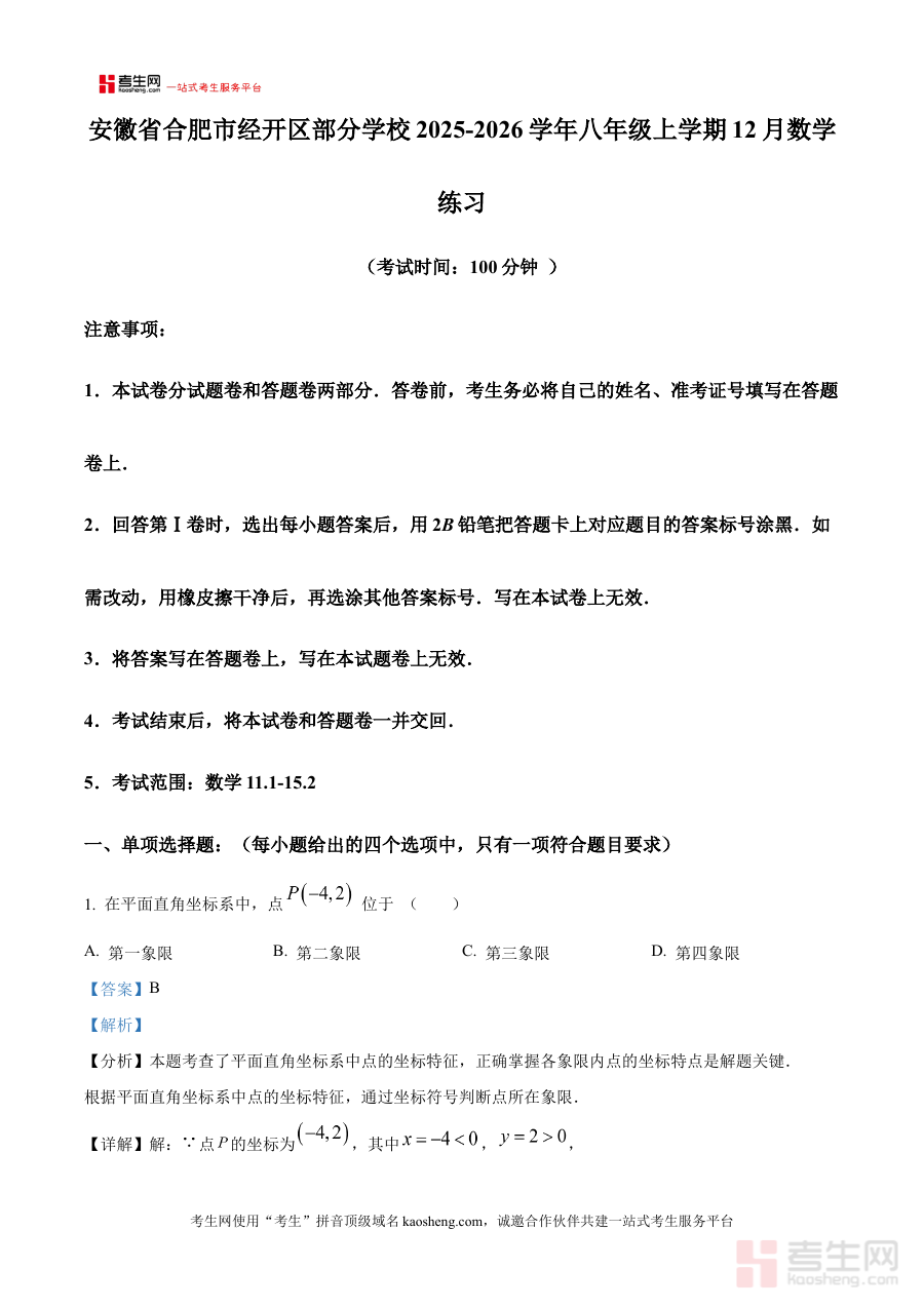 《精品解析:安徽省合肥市经开区部分学校2025-2026学年八年级上学期12月数学练习(解析版)》是针对安徽省合肥市经开区部分学校在2025-2026学年八年级上学期12月开展的数学阶段性练习所编制的解析类备考资料。该资料聚焦于特定学年、特定区域部分学校的八年级上学期数学学习进度,能够为使用者提供与该阶段练习直接相关的解析内容,帮助使用者快速把握练习的核心方向和考查重点。