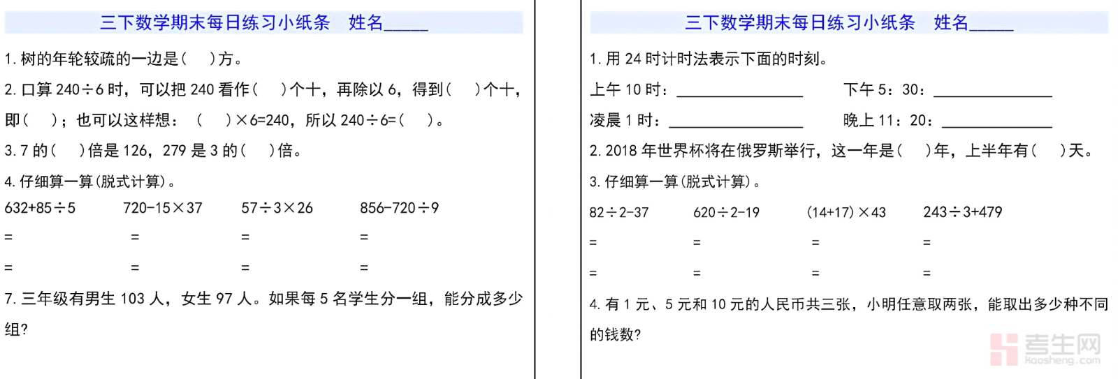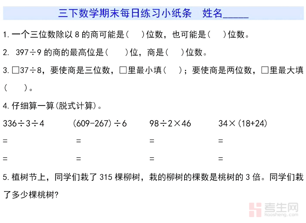 小学数学期末每日练习小纸条(三年级下)紧扣人教版三年级下册数学教材及期末考点,按天设计轻量化练习,涵盖口算、竖式计算、脱式计算、简单应用题、填空题、判断题等期末常考题型,内容聚焦两位数乘两位数、除数是一位数的除法、面积、年月日、小数初步认识等核心知识点,题量适中、难度贴合学情,每天几分钟即可完成,帮助学生巩固基础、查漏补缺、保持做题手感,适合三年级学生期末冲刺、每日一练、居家复习,高效提升数学应试能力。请添加微信 18617049513 进专属群,获取更多免费资源!