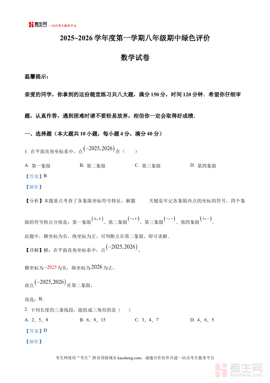 此资料主要适用于安徽省合肥市第三十八中学2025-2026学年上学期的八年级学生群体,同时也可为该校数学教师提供教学评估与辅导的参考依据,或是家长辅助孩子进行期中备考的实用工具。其解析版的核心价值在于通过详细的解题指导强化使用者对期中阶段数学知识点的理解与应用能力,帮助其在阶段检测中取得更理想的成绩,并为后续的数学学习积累有效的经验与方法。