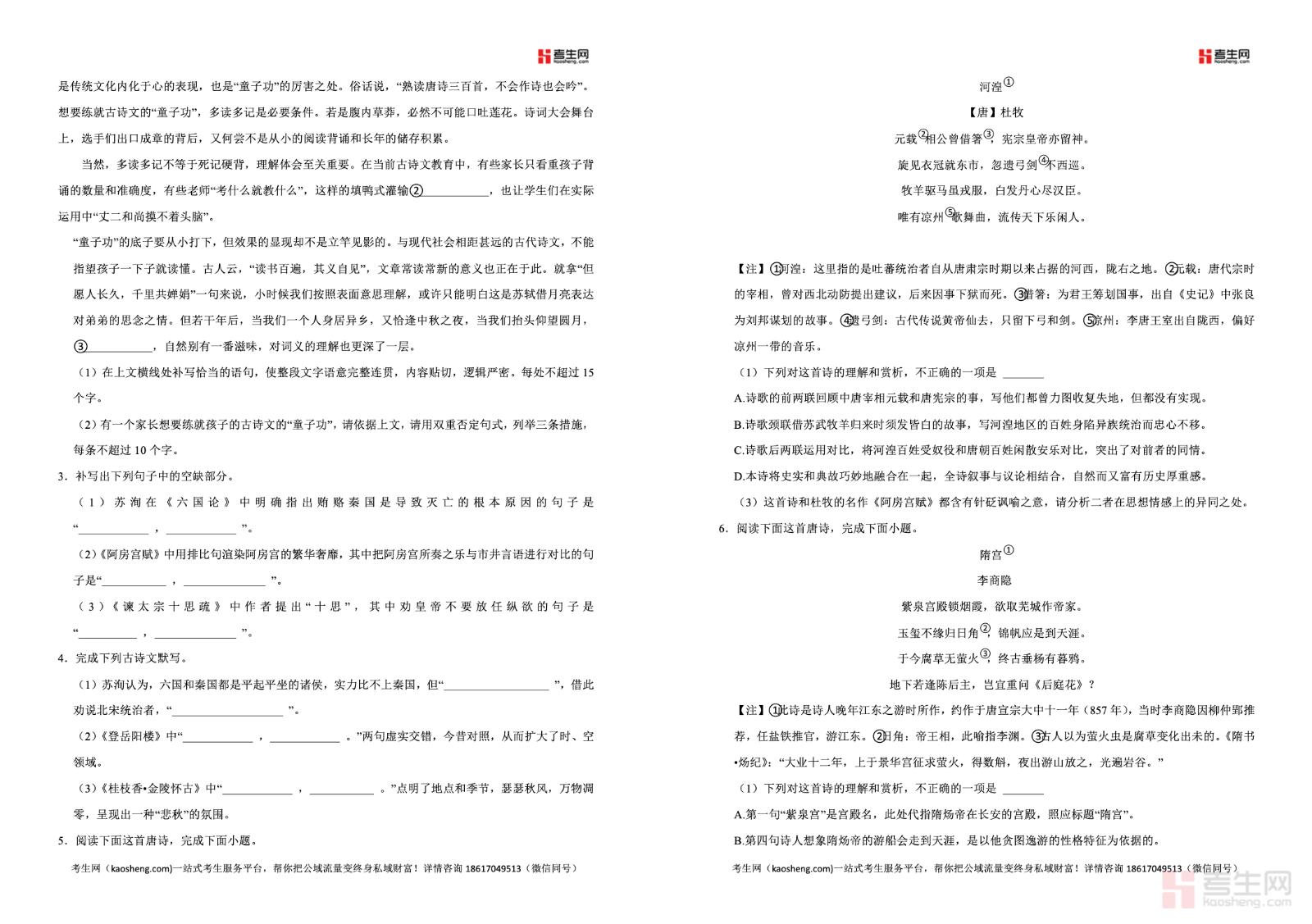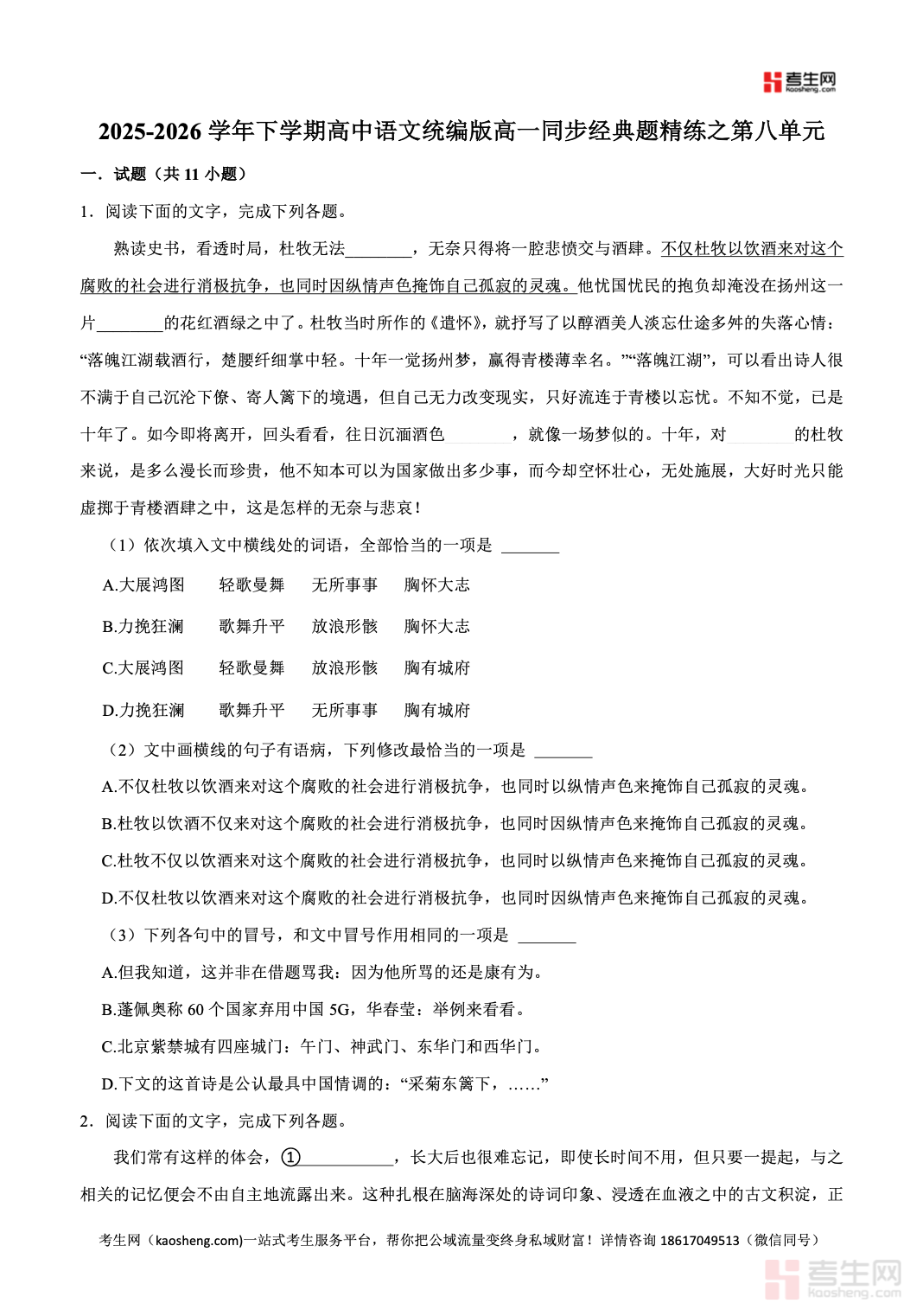 2025-2026 学年下学期高中语文统编版高一同步经典题精练之第八单元,紧扣统编版高一语文下册教材,贴合 “责任与担当” 单元主题,同步适配课堂教学进度,全面覆盖《谏太宗十思疏》《答司马谏议书》《阿房宫赋》《六国论》 四篇核心课文。聚焦文言实词虚词、特殊句式、说理艺术、文章主旨、名句默写等高频考点,兼顾基础巩固与能力提升,精选经典例题、同步变式题,题型贴合单元检测与月考考情,配套详细解析,点明解题思路与易错点,助力学生掌握借古讽今、对比论证等写作手法,夯实文言基础、提升文本解读与思辨能力,适合高一学生同步练习、单元复习、查漏补缺。请添加微信 18617049513 进专属群,获取更多免费资源!
