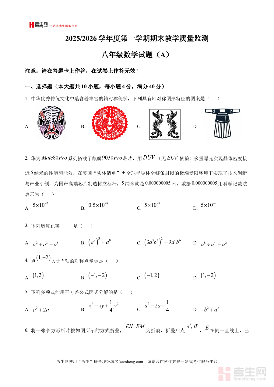《精品解析:安徽省巢湖市2025-2026学年度第一学期期末教学质量监测 八年级数学试题(A)(原卷版)》是针对安徽省巢湖市2025至2026学年度第一学期八年级数学期末教学质量监测设计的配套备考资料。该资料精准匹配本地该学段的期末检测场景,依托官方期末教学质量监测的命题方向与结构框架,保留了原卷的完整呈现形式,能够为使用者提供与本地期末监测高度贴合的资源支持,助力师生提前熟悉期末检测的整体模式与要求。