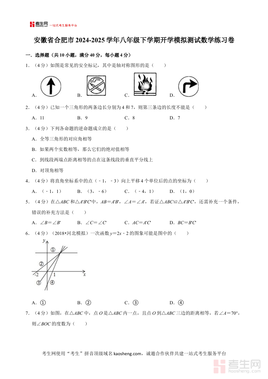 本练习卷适用于安徽省合肥市2024-2025学年的八年级学生群体,尤其是需要在开学阶段进行自我检测、查漏补缺及备考规划的学生。它不仅能够帮助学生及时发现知识薄弱点并进行针对性补强,还能引导学生建立新学期数学学习的明确目标与合理方向,提升学习的主动性与计划性;对于教师而言,该资料可作为了解学生假期学习效果及知识衔接情况的重要参考,助力教师制定更贴合学生实际需求的教学方案,促进教学质量的有效提升,实现教与学的精准对接与协同发展。
