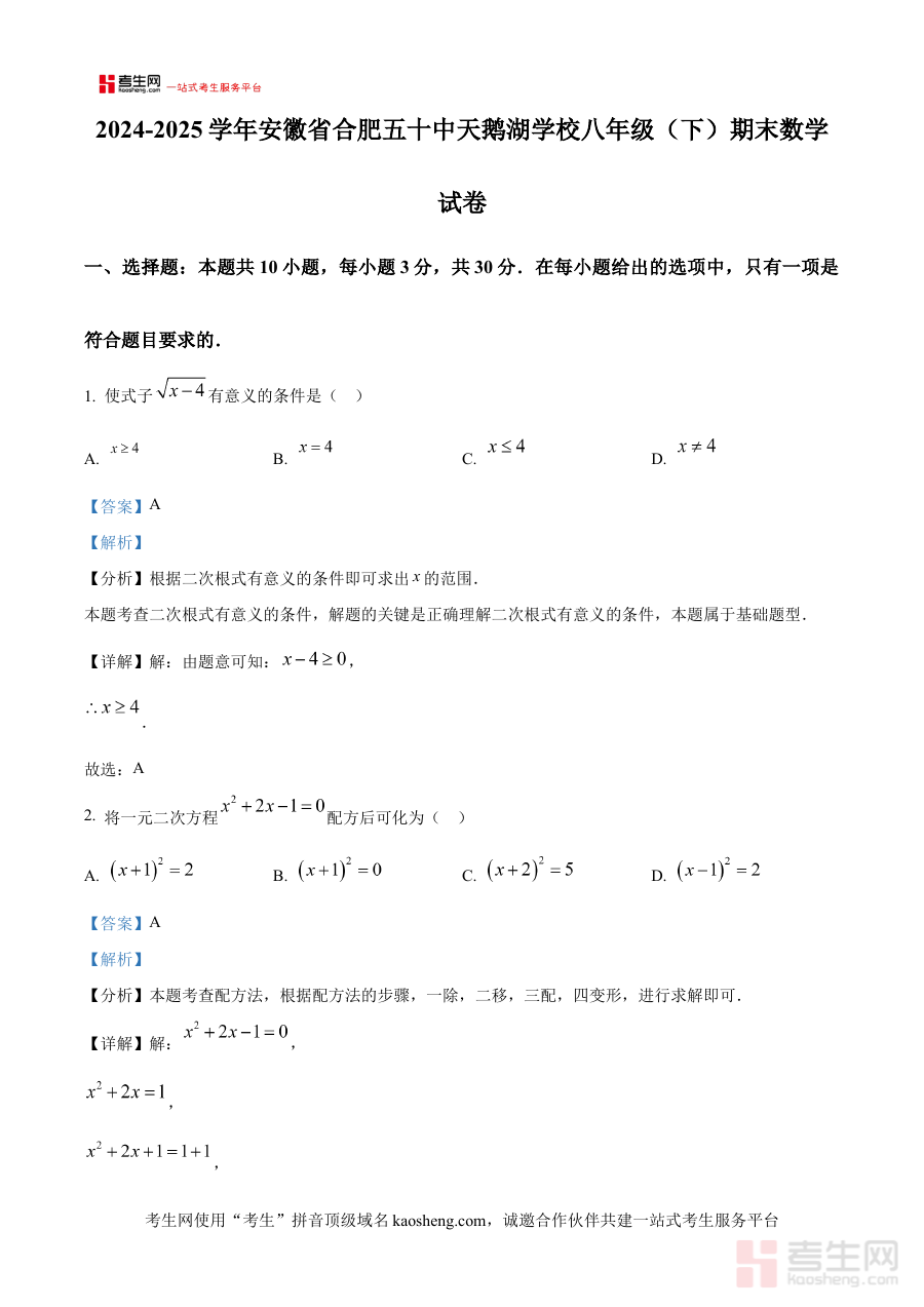 《精品解析:安徽省合肥五十中天鹅湖学校2024-2025学年八年级下学期期末数学试卷(解析版)》是针对安徽省合肥市五十中天鹅湖学校特定学年与学期的数学期末备考资料,精准对应2024-2025学年八年级下学期的期末数学考试,旨在为使用者提供与该校期末考情高度匹配的复习支持,帮助其快速把握该次考试的考查方向与要求,为后续的系统复习奠定清晰且精准的基础。