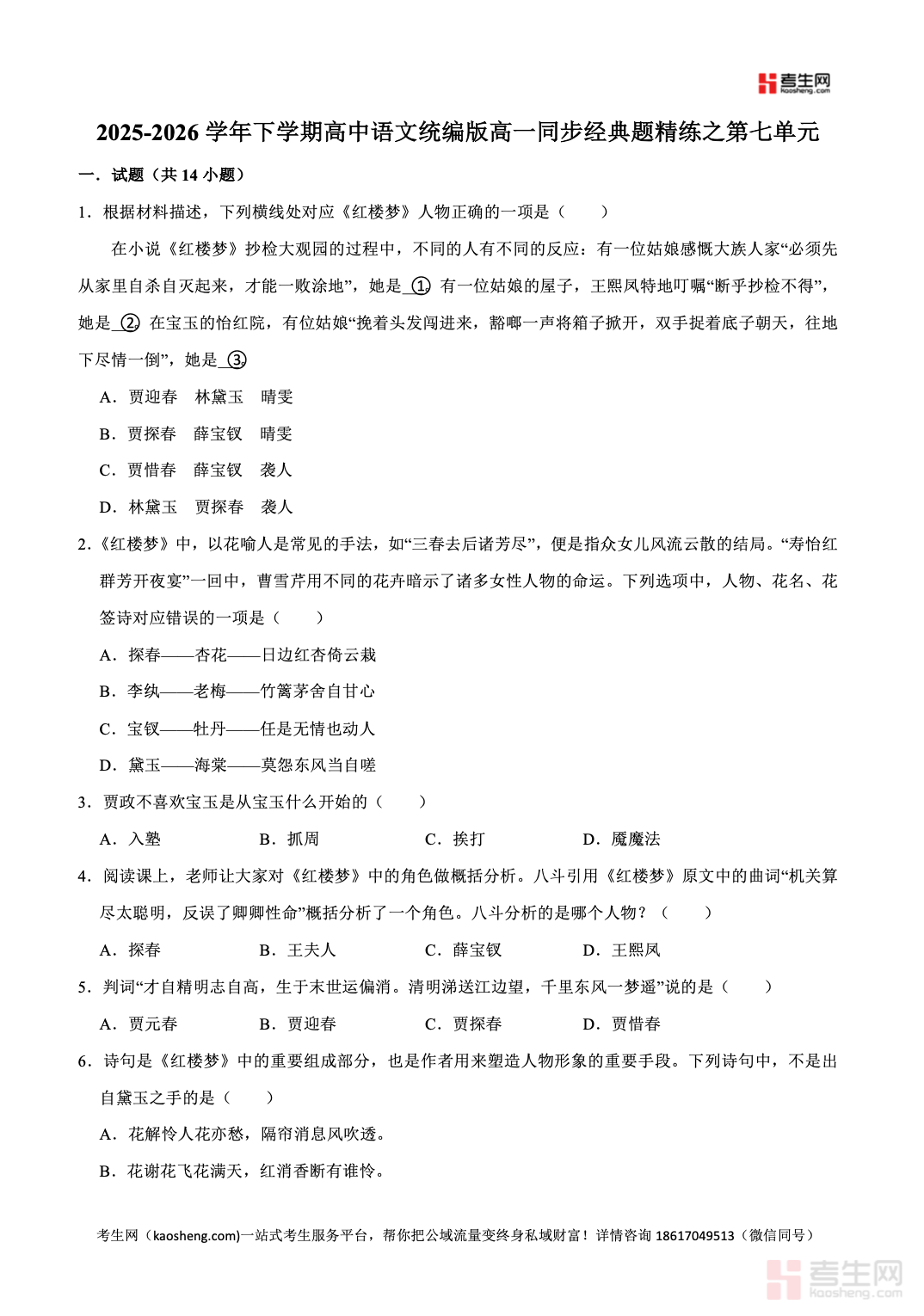2025-2026 学年下学期高中语文统编版高一同步经典题精练之第七单元,紧扣统编版高一语文下册教材单元教学要求,同步课堂教学进度,聚焦文学阅读与鉴赏、散文赏析、情感主旨分析、表现手法鉴赏、语言品味等核心考点,覆盖单元内重点篇目与核心素养考查要点,精选课内同步题、理解赏析题、高考变式题,题型贴合单元测试、期中备考考情,配有详细答案与思路解析,帮助学生夯实文本细读、情感体悟、鉴赏表达能力,强化答题规范,适合高一学生课堂同步练习、单元复习、巩固提升、考前查漏使用,稳步提高语文阅读与应试水平。请添加微信 18617049513 进专属群,获取更多免费资源!