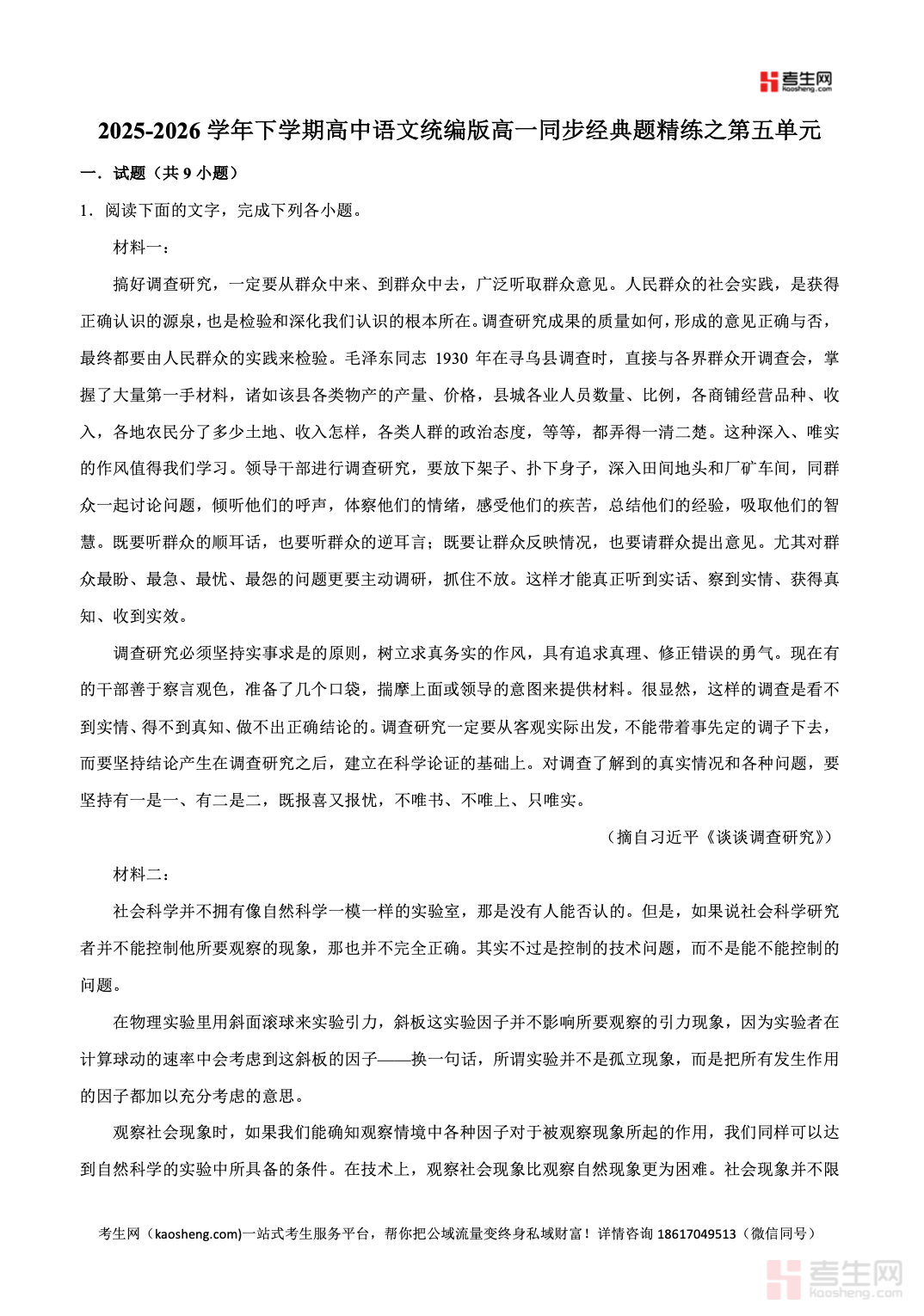2025-2026 学年下学期高中语文统编版高一同步经典题精练之第五单元,紧扣统编版高一语文下册教材单元教学重点,同步课堂教学进度,聚焦整本书阅读、作品人物分析、主题思想探究、情节结构梳理、艺术特色鉴赏等核心考点,覆盖单元指定经典篇目核心内容。精选课内基础题、阅读理解题、鉴赏分析题、高考导向变式题,题型贴合单元测试、期中备考考情,配套详细答案与思路解析,帮助学生夯实文本精读、逻辑分析、鉴赏表达能力,强化答题规范,适合高一学生课堂同步练习、单元复习、巩固提升、考前查漏补缺,稳步提高语文阅读素养与应试能力。请添加微信 18617049513 进专属群,获取更多免费资源!