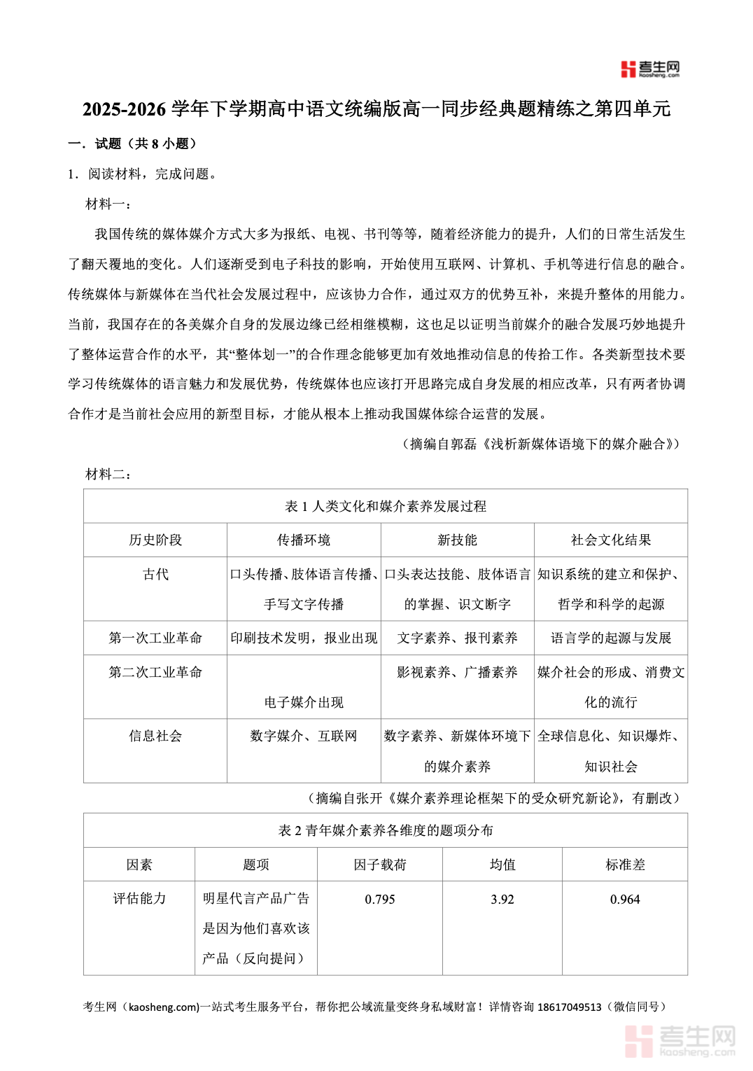 2025-2026 学年下学期高中语文统编版高一同步经典题精练之第四单元紧扣统编版高一语文下册教材与单元教学要求,同步课堂教学进度,聚焦信息时代的语文生活、多媒介阅读与表达、信息筛选整合、实用文体阅读、语言表达与运用等核心考点,覆盖单元重点学习任务与素养考查要点。精选课内基础题、信息理解题、实用文阅读题、表达应用题,题型贴合单元检测、期中备考考情,配套详细答案与思路解析,帮助学生提升信息辨识、媒介运用、语言表达能力,强化答题规范,适合高一学生同步练习、单元复习、查漏补缺、巩固提升,全面提高语文综合素养与应试能力。请添加微信 18617049513 进专属群,获取更多免费资源!