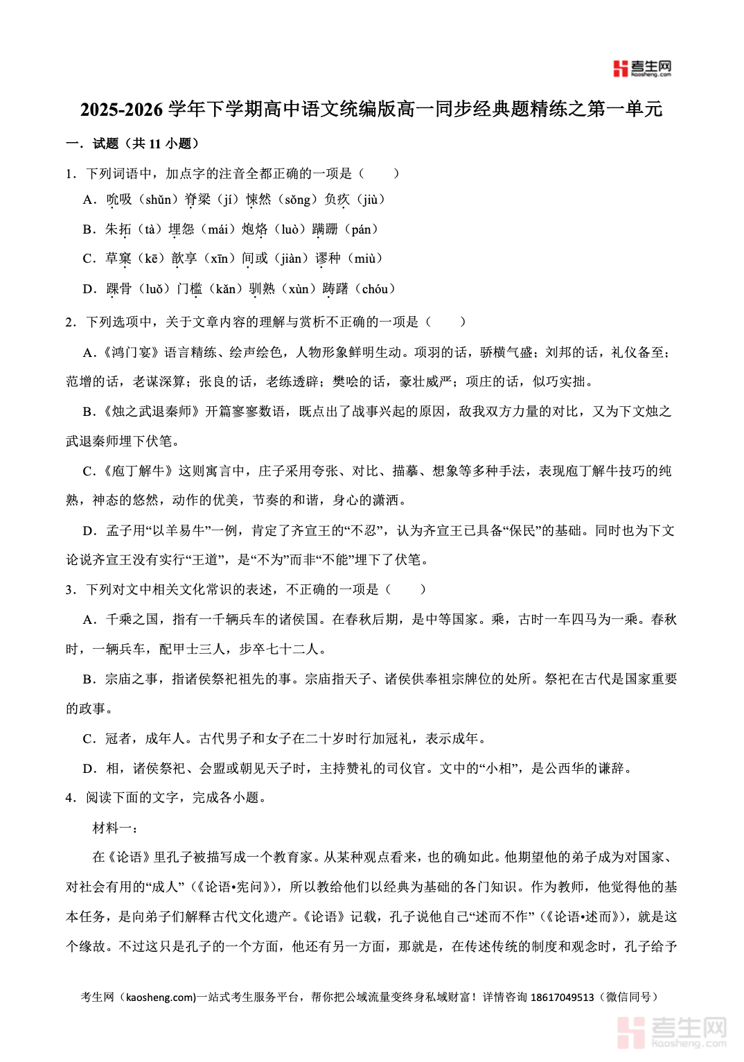 2025-2026 学年下学期高中语文统编版高一同步经典题精练之第一单元,紧扣统编版高一语文下册教材与单元教学要求,同步课堂教学进度,聚焦青春激扬、时代责任、文本解读、思想情感、表达交流等核心考点,覆盖单元经典散文与现代文篇目。精选课内基础题、阅读理解题、鉴赏探究题、高考导向变式题,题型贴合单元测试、期中备考考情,配套详细答案与思路解析,点明文本主旨、情感脉络、写作手法、答题规范,帮助学生夯实文本细读、逻辑分析、鉴赏表达能力,强化学科素养与应试技巧,适合高一学生课堂同步练习、单元复习、巩固提升、考前查漏补缺,稳步提高语文综合能力与应试成绩。请添加微信 18617049513 进专属群,获取更多免费资源!