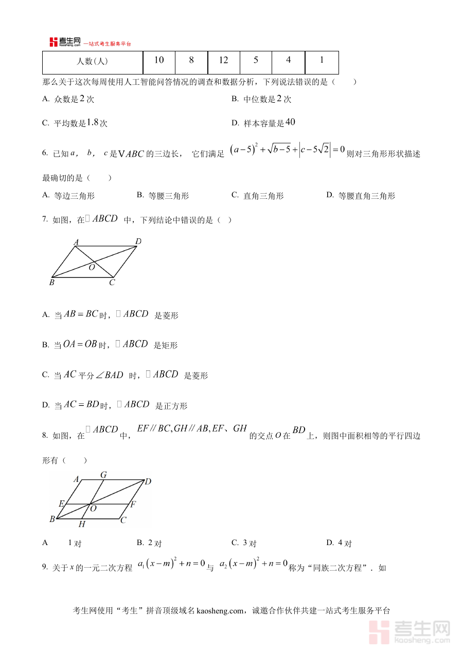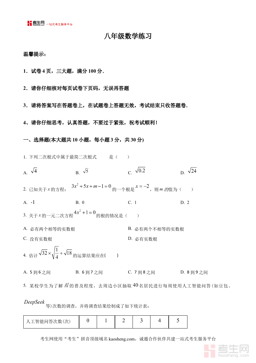该资料主要适用于安徽省合肥市五十中学西校2024至2025学年八年级学生,亦可为同地区同年级其他学生提供参考。对学生而言,使用该原卷版试题练习可熟悉期末数学考试的题型结构与难度水平,增强应试信心;对教师与家长而言,该资料可作为评估学生学习成果、制定后续教学或辅导计划的重要工具,具有较高的阶段检测与备考规划价值。