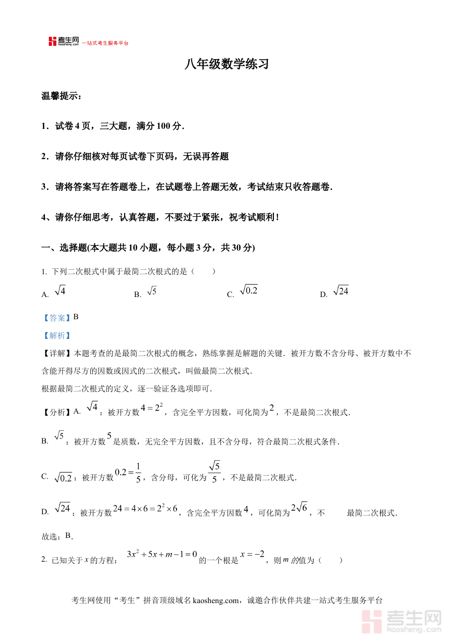 《精品解析:安徽省合肥市五十中学西校2024-2025学年八年级下学期6月期末数学试题(解析版)》是针对安徽省合肥市五十中学西校特定学年学期的期末数学考试所编制的备考资料。该资料聚焦于2024-2025学年八年级下学期6月的期末检测场景,紧密贴合该校本学期数学教学进度与期末考核方向,为学生提供了与本校考试直接相关的参考内容。作为解析版资料,它不仅包含试题本身的呈现,更注重对试题的深度解读与分析,帮助使用者更好地理解考试要求与内容导向,为后续的复习与备考提供清晰的方向指引。