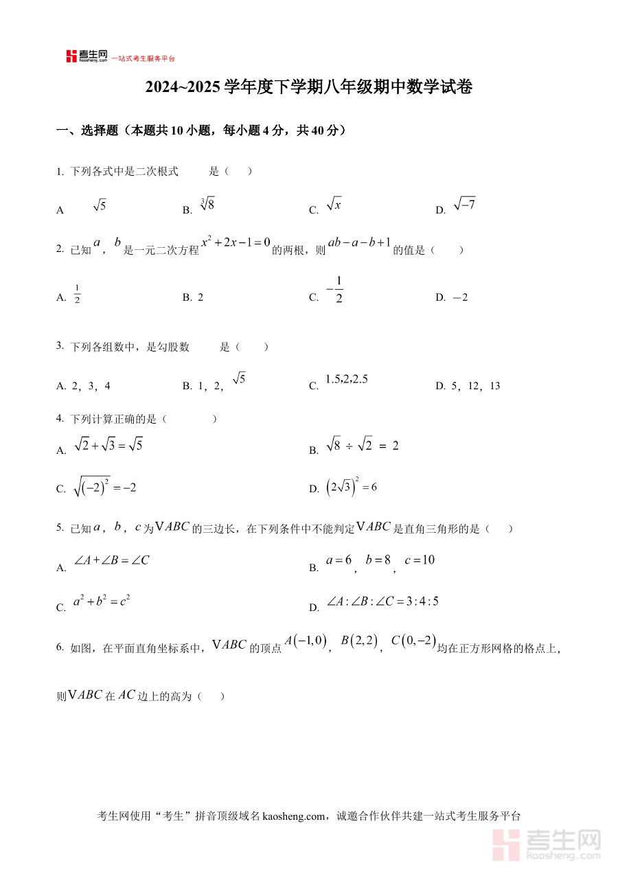 这份原卷资料可作为八年级学生期中备考的核心工具,帮助学生考前熟悉考试流程与时间分配,开展有效的自我学情诊断;对于教师而言,它能辅助了解学生对数学知识的掌握情况,为教学中的重点强化和难点突破提供参考依据,也可用于班级内部阶段检测,及时调整教学进度与策略;此外,它还能为家长提供了解孩子学习状况的窗口,便于更好配合学校和孩子进行备考规划。