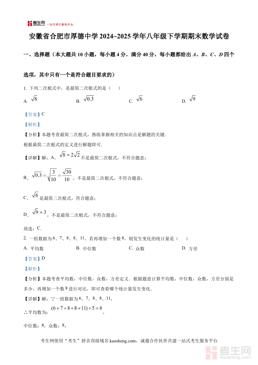 《精品解析:安徽省合肥市厚德中学2024~2025学年八年级下学期期末数学试卷(解析版)》是针对安徽省合肥市厚德中学特定学年学期与年级学科的期末数学考试备考资料。它锚定该特定学年学期与年级的数学学习阶段,贴合该校期末数学考试的实际场景,为使用者提供与该考试直接关联的系统性解析支持,是具有明确学校、学年、学期、年级及学科指向性的优质备考资源,能够精准对接该阶段学生的期末复习需求。