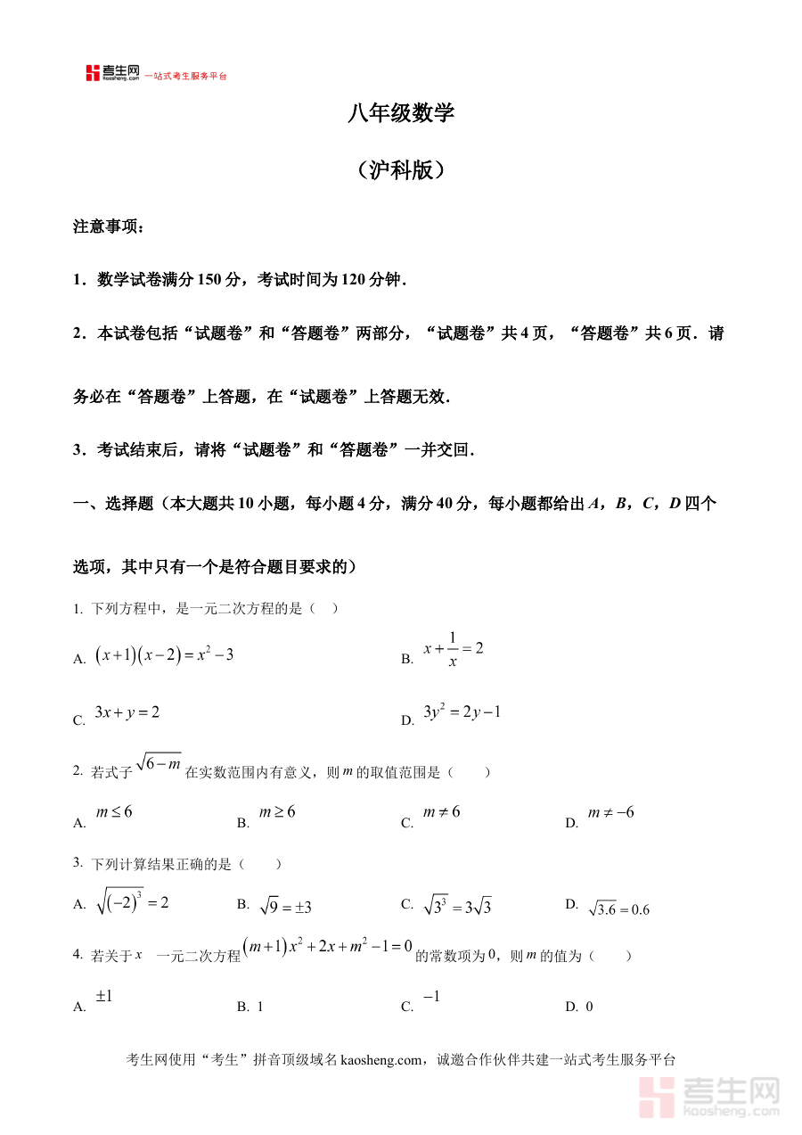 作为阶段性教学与备考的重要辅助工具,该原卷版可有效支持八年级学生进行自我学情诊断,帮助学生在学期初期及时把握自身数学知识的掌握程度;同时也为教师提供了真实的阶段检测样本,便于教师分析学生群体的学习状况,为后续教学内容调整和备考规划制定提供客观依据,助力提升教学与备考的针对性和有效性。