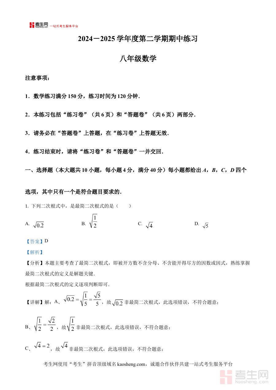 《精品解析:安徽省合肥市庐江县2024-2025学年八年级下学期4月期中数学试题(解析版)》是针对安徽省合肥市庐江县特定学年与学段的期中数学考试打造的备考资料,明确对应2024-2025学年八年级下学期4月的期中测试场景。作为本地化的备考资源,它紧密贴合庐江县八年级下学期数学教学进度与期中测试的考查范围,以解析版形式呈现,依托本地期中考试的命题背景与阶段学习目标,为使用者提供与本次考试直接相关的参考内容,帮助其快速把握考试的核心方向与要求。