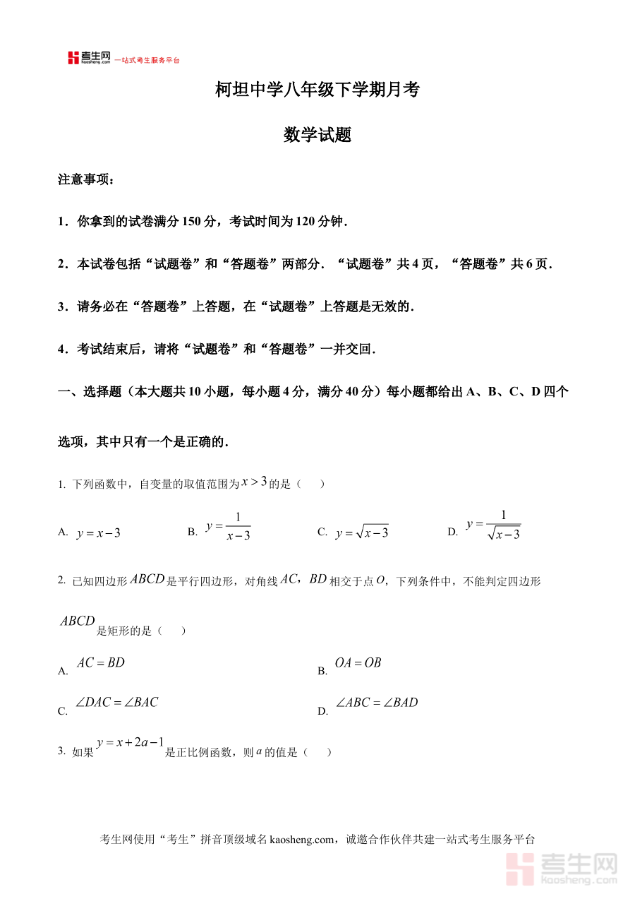 《精品解析:安徽省合肥市庐江县柯坦中学2024-2025学年八年级下学期5月月考数学试题(原卷版)》是针对安徽省合肥市庐江县柯坦中学特定学年学期的数学阶段性考试资料。该资料对应2024-2025学年八年级下学期5月的月考场景,属于学校内部阶段性教学评估的配套资源,能够直接反映该阶段学校数学教学的进度安排与考查方向,为相关群体提供与实际考试场景高度贴合的备考支持。