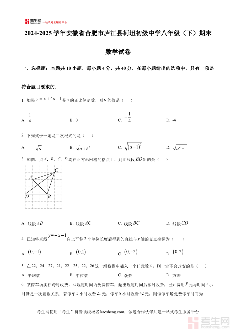 本试卷主要适用于安徽省合肥市庐江县柯坦初级中学2024-2025学年下学期的八年级学生、该学校的数学教师及学生家长。对于学生而言,使用该原卷版试卷练习可熟悉期末考的题型结构与作答节奏,提升备考效率;对教师来说,可将其用于课堂模拟测试或作业布置以精准把握学生学习漏洞;对家长而言,通过该试卷能更好地参与孩子学习过程,共同促进孩子数学能力提升。