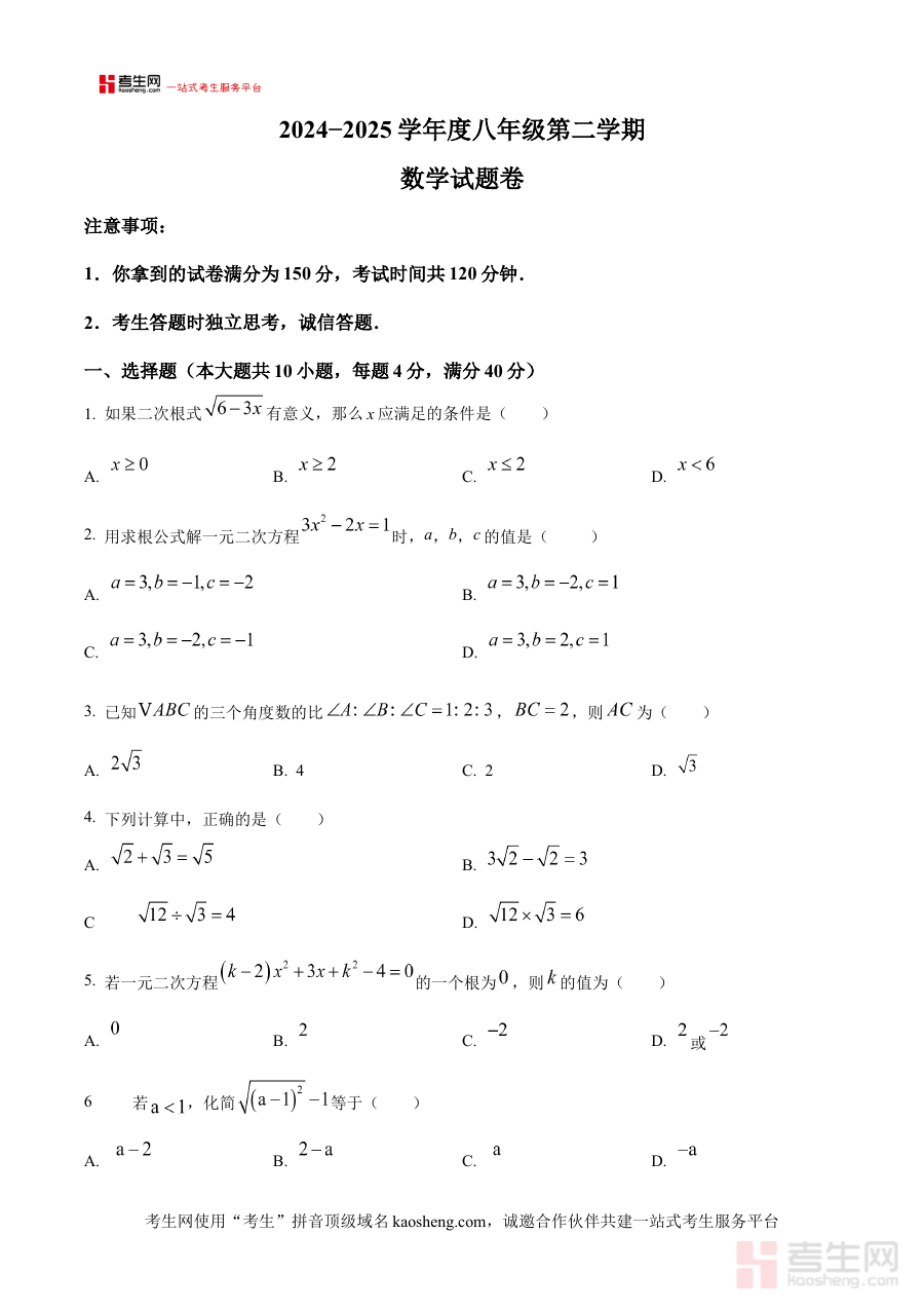 该资料的适用人群主要涵盖安徽省合肥市第三十八中学八年级下学期的学生、该校数学教师以及关注孩子数学学习情况的家长。对于学生,使用原卷进行模拟练习能提前熟悉考试形式与节奏,提升应对期中考试的适应性与自信心;对于教师,可通过分析原卷优化教学策略与复习重点;对于家长,则能更好地配合学校教学安排,为孩子提供有效的学习支持,共同促进学生在期中数学考试中实现能力提升与成绩进步。