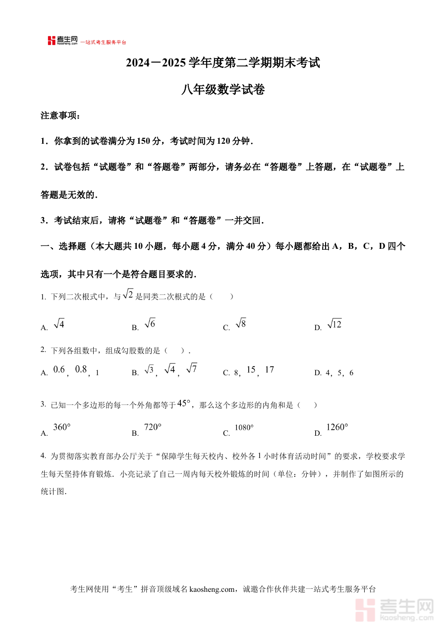 《精品解析:安徽省合肥市第三十八中学北校2024—2025学年下学期八年级数学期末试卷(原卷版)》是针对安徽省合肥市第三十八中学北校2024至2025学年下学期八年级学生数学学科期末测试的原卷类备考资料。该资料直接反映了该校该学年下学期八年级数学期末考查的官方呈现形式,为使用者提供了与实际考试一致的试卷载体,有助于提前感知考试的整体结构与考查导向,是期末备考阶段不可或缺的基础参考材料之一。