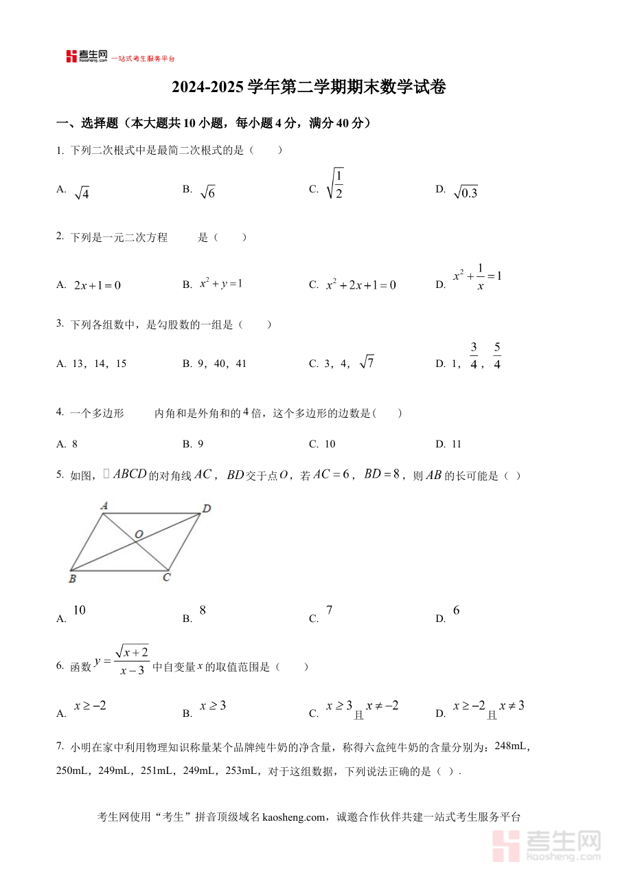 《精品解析:安徽省合肥市第四十五中学2024-2025学年下学期八年级数学期末试卷(原卷版)》是面向安徽省合肥市第四十五中学2024-2025学年下学期八年级学生推出的数学期末考备考资料。该资料严格依据该校该学年下学期八年级数学期末考试的实际要求制作,以原卷版形式完整保留试卷原始结构与内容呈现方式,为使用者提供与真实考试场景高度一致的备考载体,有助于备考者提前熟悉考试的题型分布、题量设置及整体考查方向,是期末复习阶段不可或缺的重要参考资源。