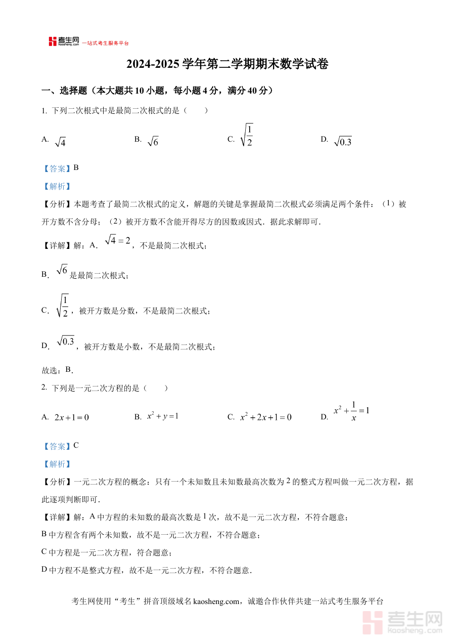 《精品解析:安徽省合肥市第四十五中学2024-2025学年下学期八年级数学期末试卷(解析版)》是针对安徽省合肥市第四十五中学2024至2025学年下学期八年级数学期末考试的专业备考资料,精准对应该学期的教学进度与期末检测要求。作为该校期末考相关的解析类资料,它聚焦于八年级下学期数学学科的期末考查方向,为使用者提供了与学校期末考直接关联的参考依据,有助于提前熟悉期末考的考查形式与核心重点。