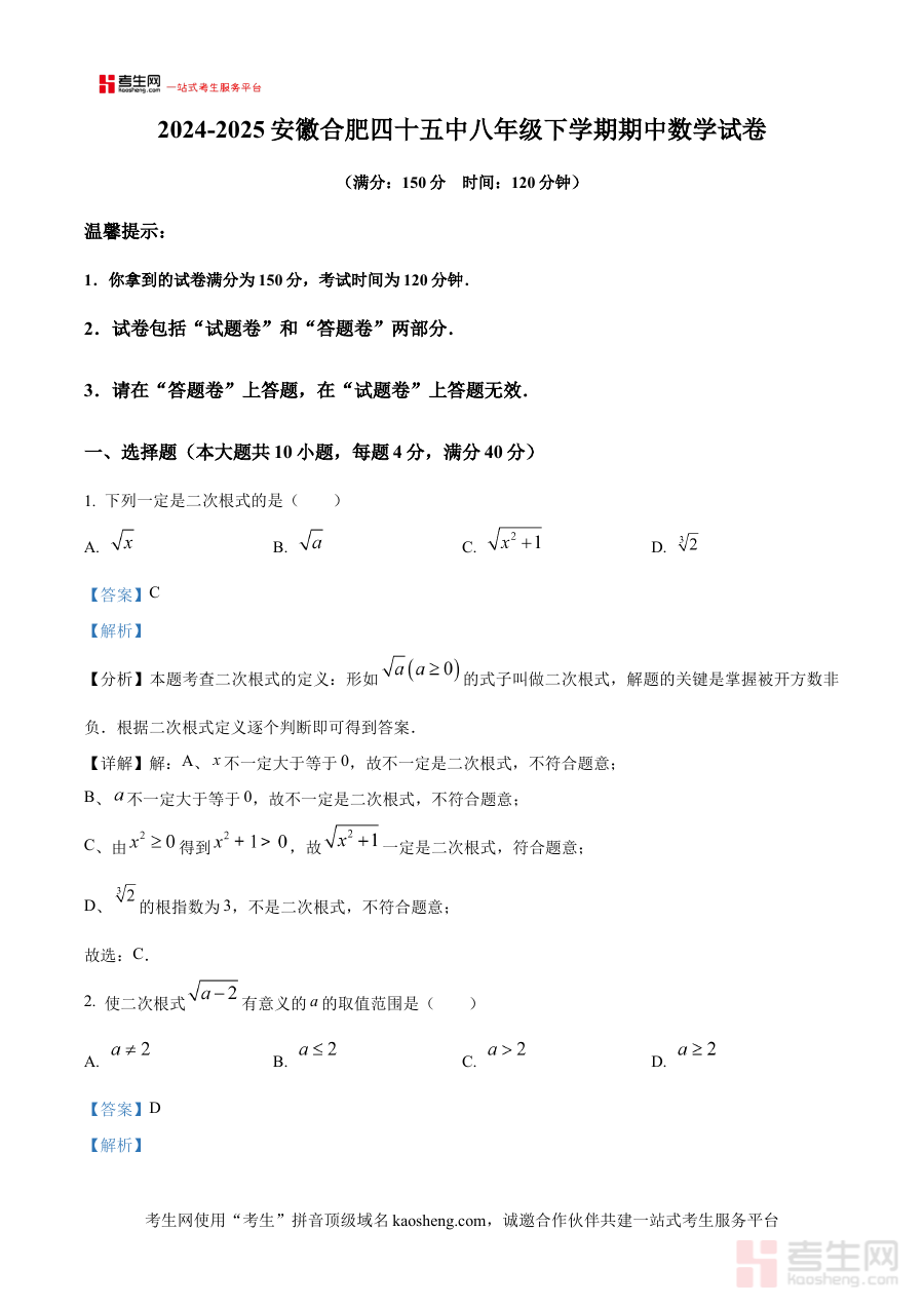 《精品解析:安徽省合肥市第四十五中学2024-2025学年八年级下学期期中考试数学试卷(解析版)》是针对安徽省合肥市第四十五中学特定学年学期的数学期中考试备考资料,明确覆盖2024-2025学年八年级下学期这一关键学习阶段,依托该校期中考试的实际场景,结合该学期数学教学进度与要求,为学生提供贴合本校教学实际的考试内容解析,有助于学生提前熟悉考试形式、把握考查方向与难度定位,是该阶段数学学习成果检验与备考准备的重要参考依据。