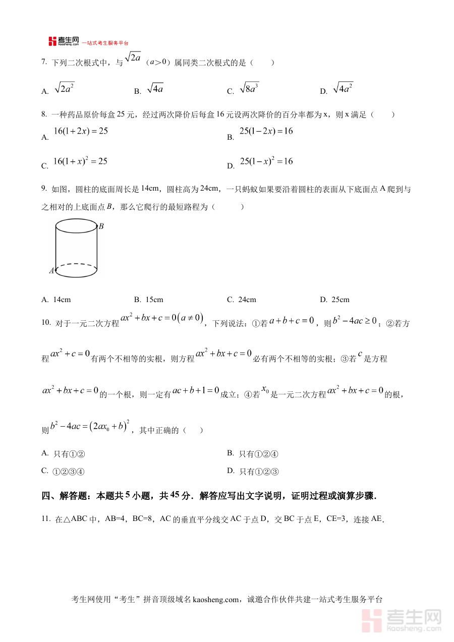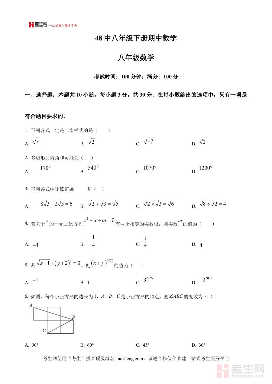 《精品解析:安徽省合肥市第四十八中学2024-2025学年八年级下学期数学期中试卷(原卷版)》是一份针对特定学段与考试场景的数学备考资料。它聚焦安徽省合肥市第四十八中学2024至2025学年第二学期八年级学生的数学期中测试需求,依托该校实际期中试卷原卷内容,为使用者提供与校内考试直接对接的学习参考载体。这份资料的原卷属性确保其与该校教学进度、命题风格高度一致,能真实反映该校八年级下学期数学期中考试的考查方向与试卷结构特点。