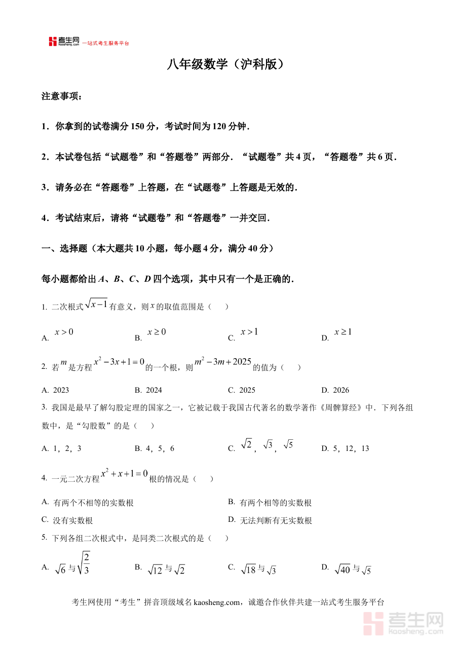 本资料适用于参与安徽省合肥市蜀山区琥珀联考的八年级学生、相关学校的数学教师及教学管理人员。对学生而言,使用该原卷版试题进行练习能有效提升对考试形式的适应度,助力中期备考的精准性与高效性;对教师而言,通过分析原卷内容可更好把握区域联考命题重点,增强教学指导针对性;对教学管理者而言,该资料为评估区域教学质量、调整教学资源分配提供客观数据支撑,有助于推动区域内数学教学质量整体提升。