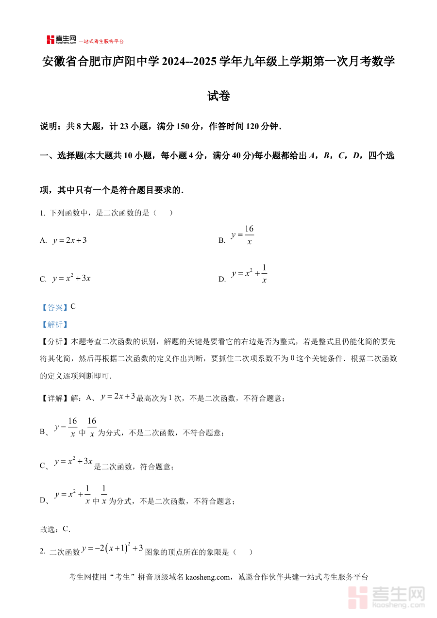 《精品解析:安徽省合肥市庐阳中学2024--2025学年九年级上学期第一次月考数学试卷 (解析版)》是针对安徽省合肥市庐阳中学特定学年与学段的数学学科阶段性考试资料,其对应的考试为该校2024至2025学年九年级上学期首次月考。作为解析版资料,它紧密贴合该次月考的考查范围与要求,为相关使用者提供了与考试直接关联的内容支撑,是适配该阶段数学学习与考试准备的专业资料。
