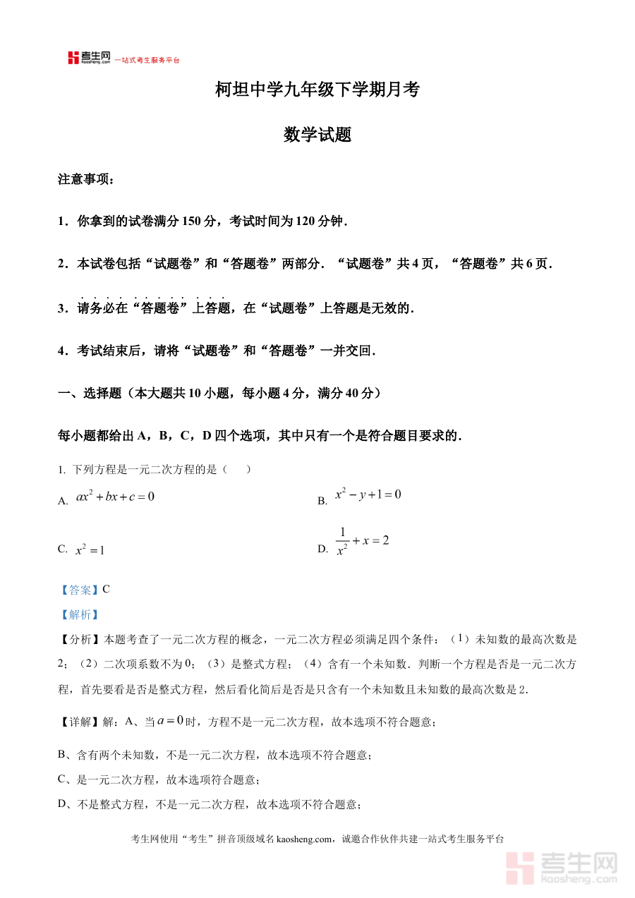 《精品解析:安徽省合肥市庐江县柯坦中学2025-2026学年九年级上学期9月月考数学试题(解析版)》是专门针对安徽省合肥市庐江县柯坦中学特定学年与学段的数学月考配套解析资料。该资料精准对应2025-2026学年九年级上学期9月这一新学期初期的关键时间节点,贴合该校九年级学生数学学习的进度与阶段性检测需求,为相关使用者提供专业、系统的试题解析支持,是符合该校教学实际与学生学习节奏的重要备考资源。