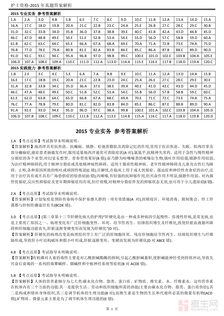 《2015护士执业考试答案及解析》是针对2015年度全国护士执业资格考试推出的专业配套备考资料,精准聚焦该年度考试的核心内容方向,为考生提供了对应考试科目的完整答案参考与系统性深度解析服务。作为考试相关的辅助资料,它紧密贴合该年度考试的整体框架,旨在帮助考生更好地理解考试要求与内容逻辑。