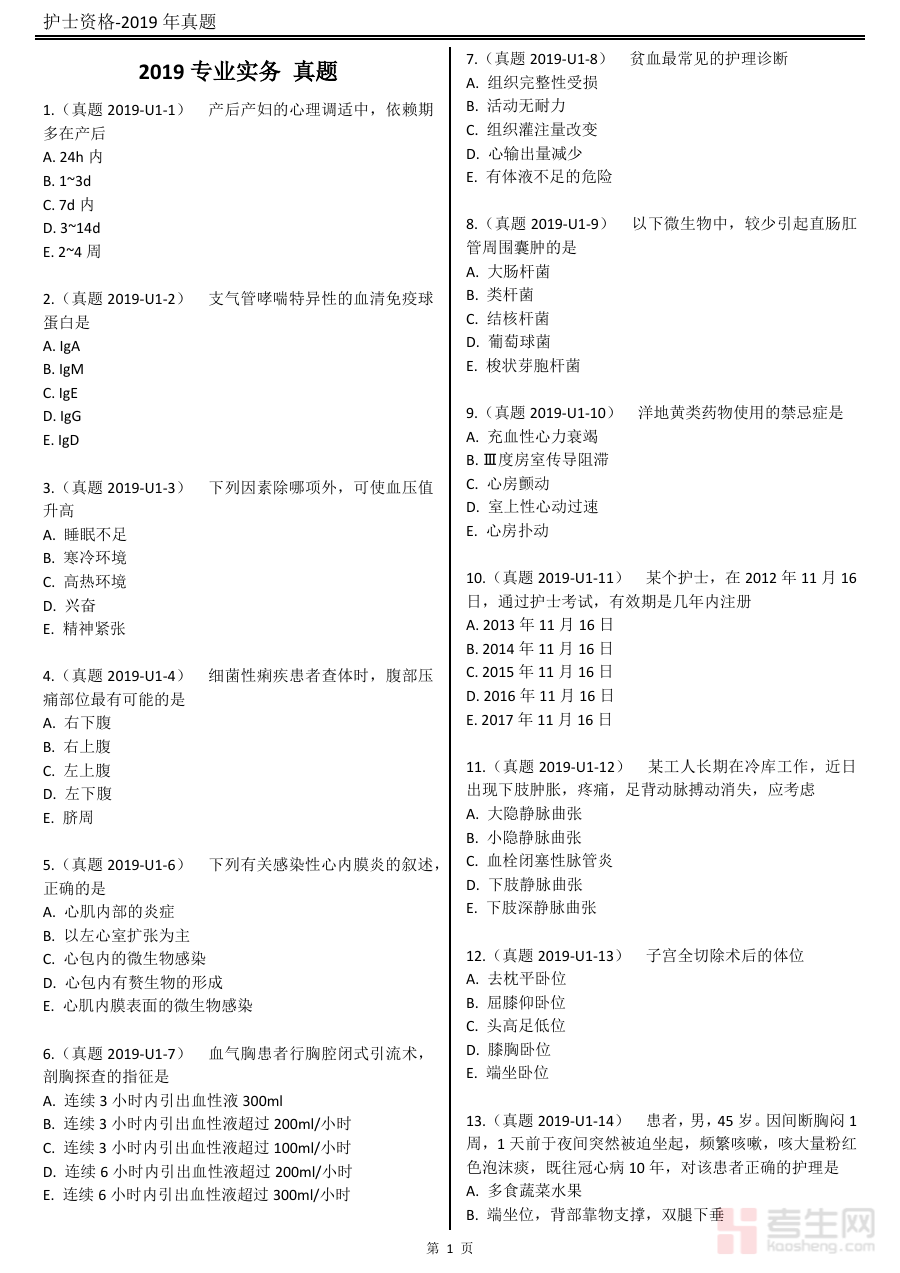《2019护士执业考试原卷》是2019年度全国护士执业资格考试的官方原始试卷资料,作为护士执业准入的核心考试依据之一,它精准呈现了该年度考试的命题框架与考查维度,能够为备考者提供与实际考试高度一致的练习场景,帮助备考者直观感受考试的整体结构、命题逻辑及考查重点方向。