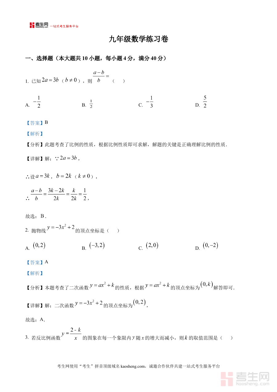 该解析版试卷主要用于九年级学生在期中备考阶段开展自我学情诊断与备考规划优化。学生通过使用这份资料,可以清晰识别自身在数学学科知识体系中的掌握程度与薄弱环节,进而针对性地调整复习策略;教师也可借助这份资料辅助设计期中复习教学方案,为学生提供更精准的指导支持,帮助学生明确期中复习的核心重点与有效路径,提升复习的针对性与效率。