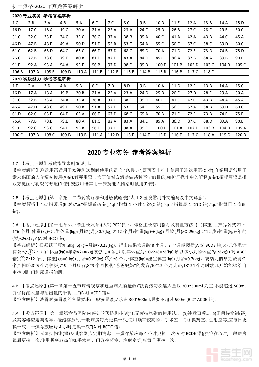 《2020护士执业考试答案及解析》是针对2020年度全国护士执业资格考试打造的配套备考资料,紧密围绕该年度考试的核心目标与评价要求,为考生提供精准的答案参考与专业解析服务。作为护士执业考试备考体系中的重要辅助资源,它贴合2020年考试的命题逻辑与考查重点,帮助考生快速识别自身知识薄弱环节,建立对考试内容的清晰认知。