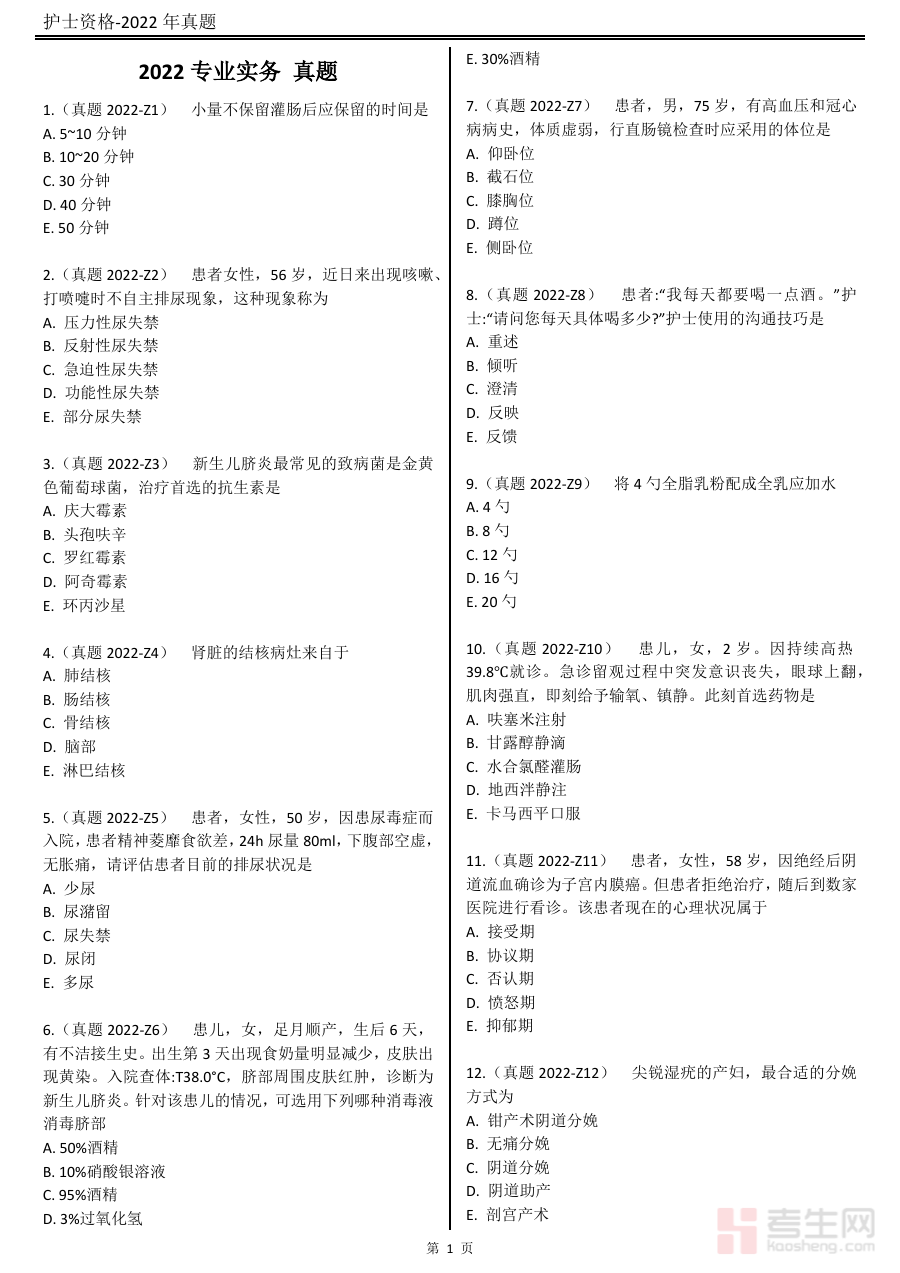 该资料可用于考生的学情诊断与备考规划工作:考生通过完成这份原卷,能清晰了解自身在护士执业相关知识与技能领域的掌握情况,识别薄弱环节以调整复习重点;同时,它也可作为教师或培训机构指导考生备考的重要参考工具,辅助制定更具针对性的学习计划与训练方案。