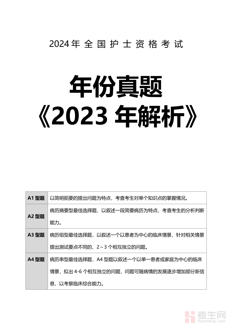 《2023护士执业考试答案及解析》是针对2023年度护士执业资格考试推出的配套备考资料,聚焦该考试的核心需求,为考生提供精准的答案参考与深度解析支持。它基于当年考试的命题方向与考察重点,旨在帮助考生快速把握考试内容的关键要点,为备考过程提供可靠的内容依据。