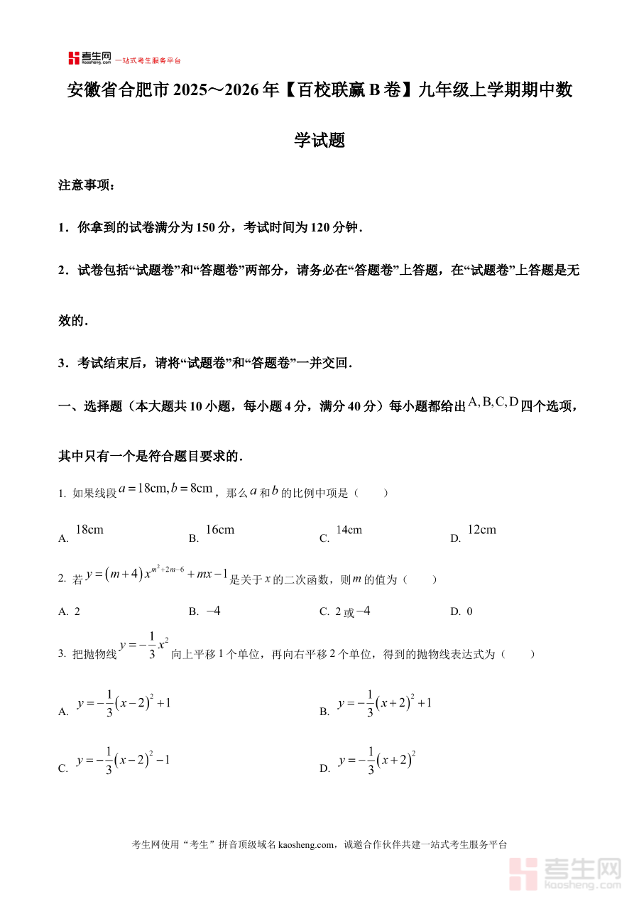 《精品解析:安徽省合肥市2025~2026年【百校联赢B卷】九年级上学期期中数学 试题(原卷版)》是面向安徽省合肥市2025-2026学年九年级学生的期中数学备考资料,属于百校联赢B卷系列的原卷版本。它结合该区域九年级上学期数学教学进度与期中考查要求,呈现了同期百校联考的数学试卷原貌,为使用者提供了贴合本地教学实际和命题趋势的备考资源。
