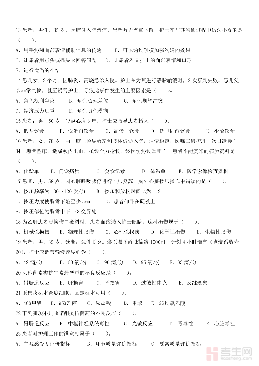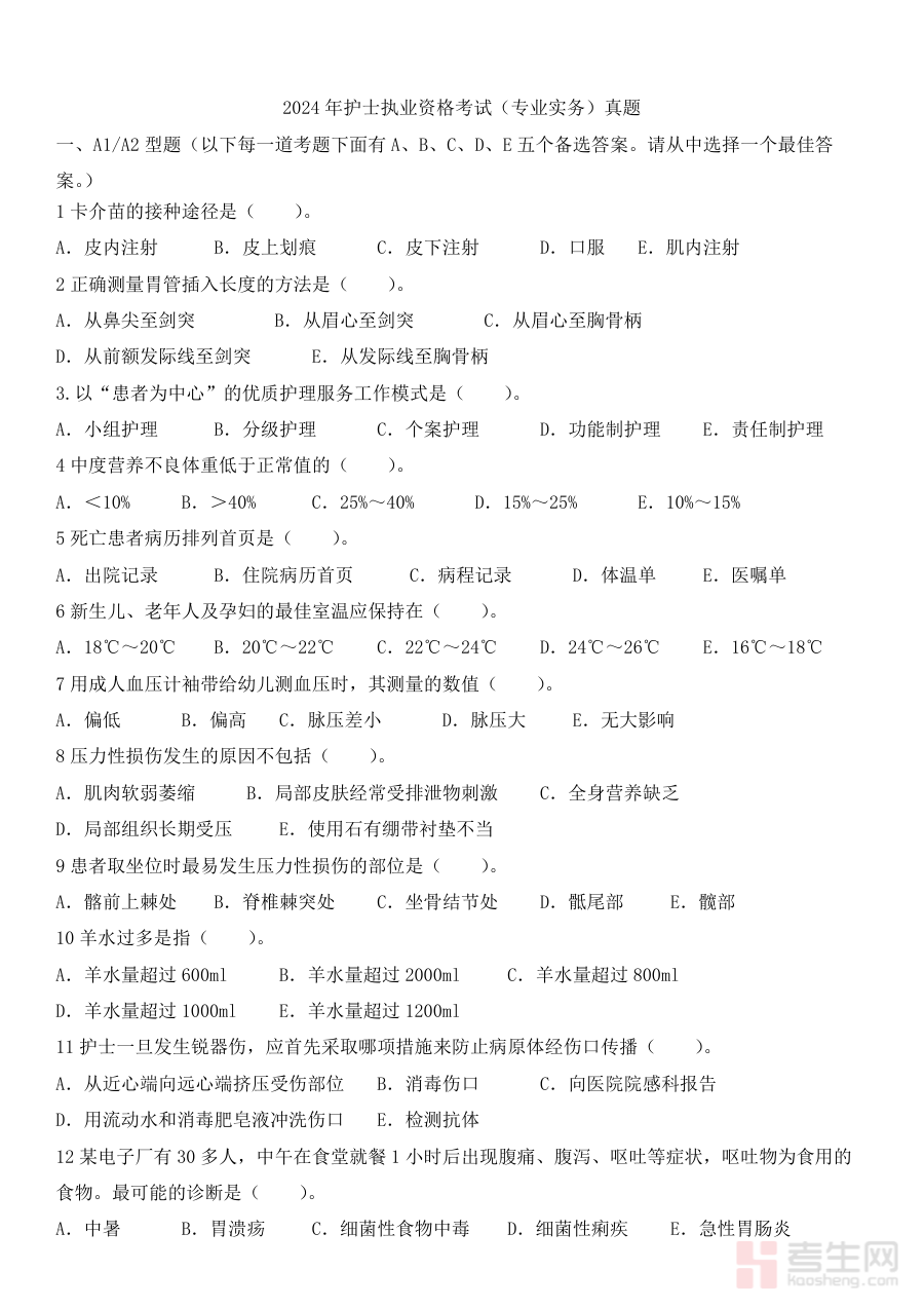 该资料适用于所有备战2024年护士执业资格考试的群体,包括在校护理专业学生、在职护理人员及其他有志从事护理工作的备考者。借助原卷进行练习,考生不仅能熟悉考试形式与流程,还能通过模拟真实考试环境提升应试能力与心理素质,为顺利通过考试积累实战经验,是备考过程中不可或缺的重要资源。