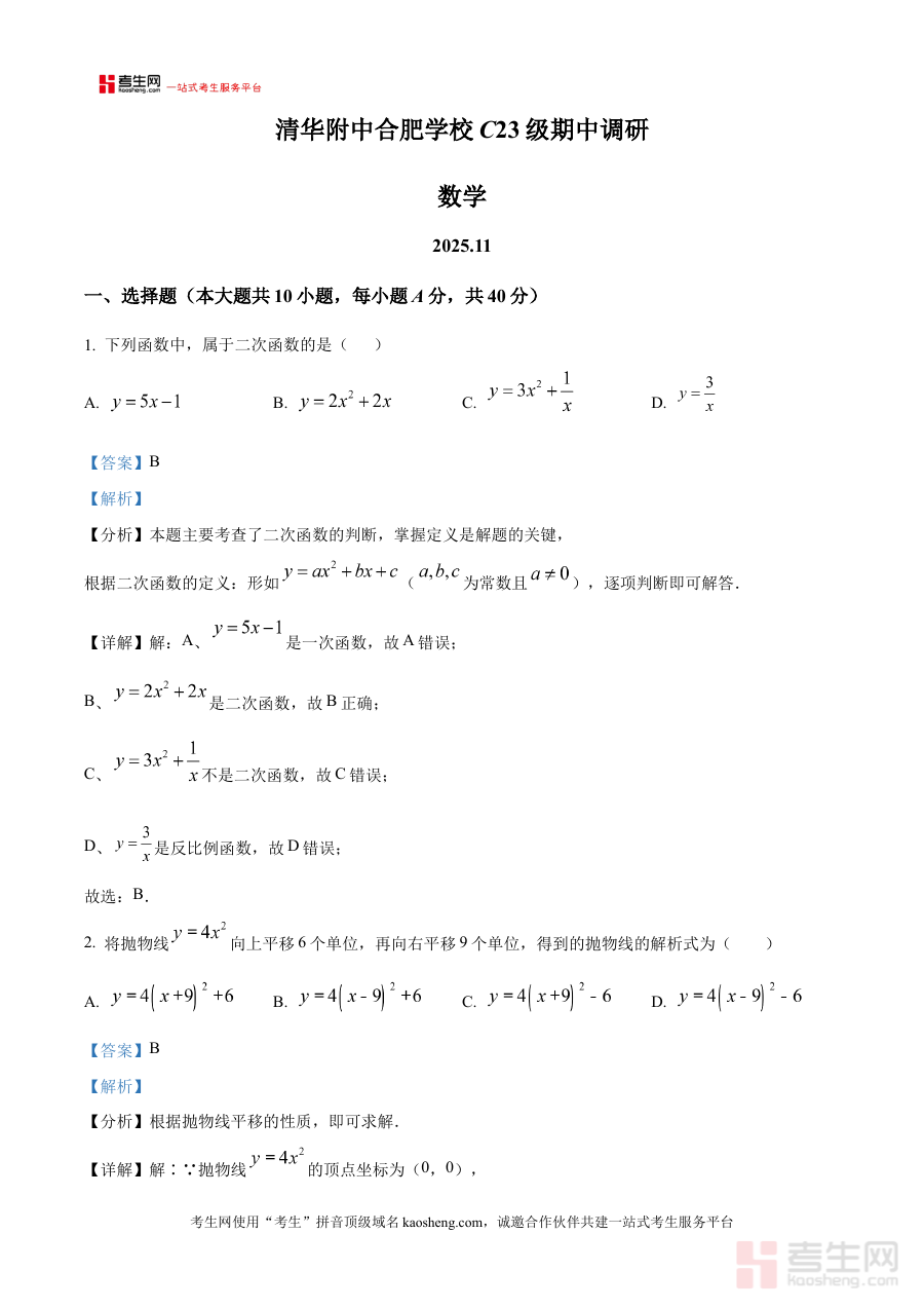 《精品解析:安徽省合肥市清华附中合肥学校2025--2026学年上学期九年级期中数学试卷(解析版)》是针对安徽省合肥市清华附中合肥学校2025-2026学年上学期九年级期中数学考试编制的备考资料,其核心定位是服务于该学校九年级学生在期中阶段的数学学习巩固与应试准备,依托学校自身的教学进度与期中检测要求形成内容框架,为学生提供贴合本校教学实际的复习参考依据。