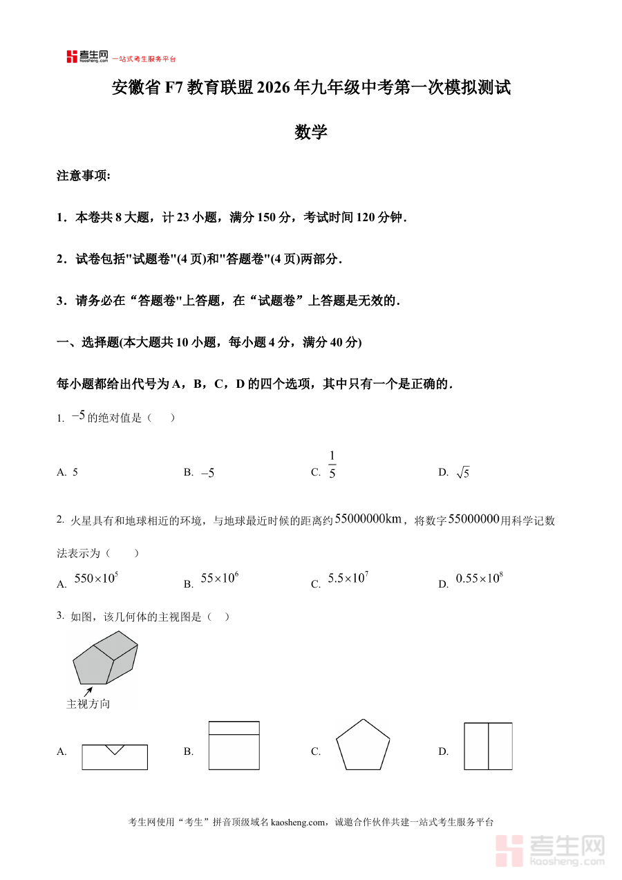 《精品解析:安徽F7教育联盟合肥寿春中学等校2026年九年级中考第一次模拟测试数学试题(原卷版)》是针对2026年安徽省范围内F7教育联盟及合肥寿春中学等校九年级学生的中考第一次模拟测试数学科目的备考资料。该资料依托区域教育联盟联合命题背景,贴合当地中考数学考查方向与命题特点,为学生提供符合阶段复习进度的标准化模拟测试资源。