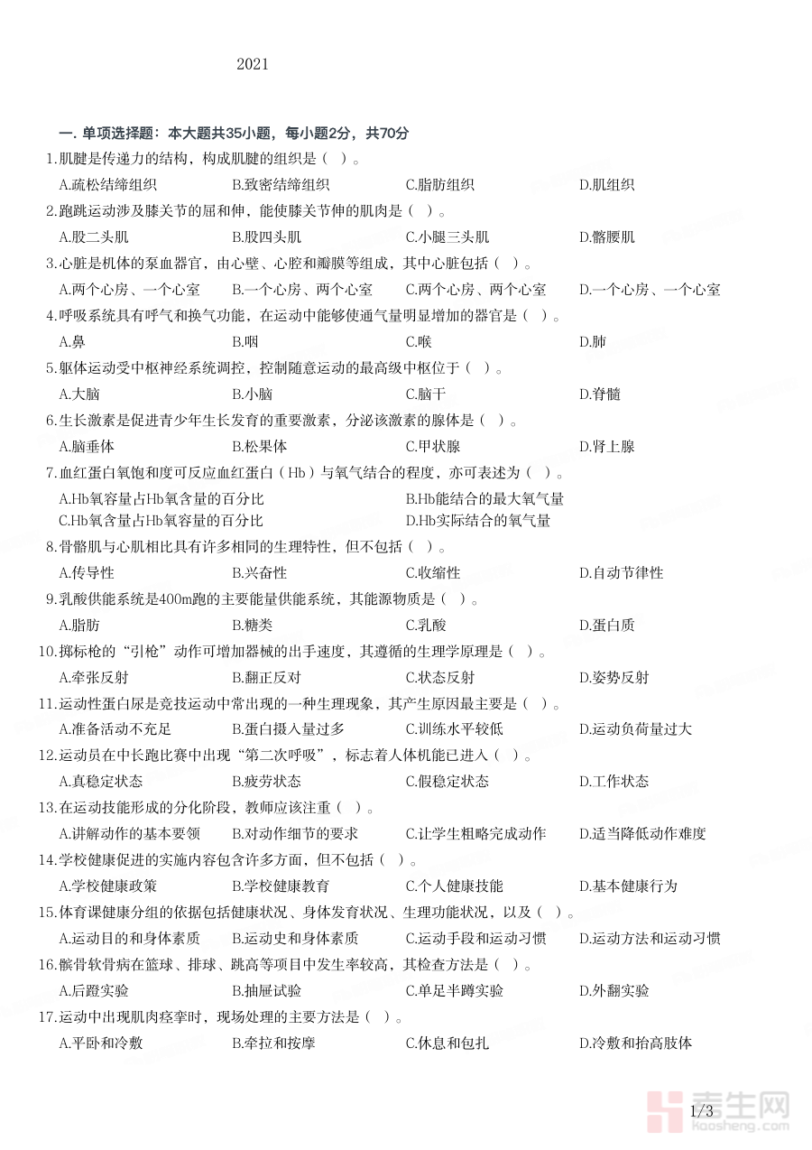 《2021年上半年教师资格证考试《初中体育与健康》题》是针对2021年上半年全国教师资格证考试中初中体育与健康学科的专项题目资料,属于教师资格证备考体系中的重要组成部分。该资料紧密贴合当次考试的时间节点与学科考查要求,能够为考生提供与考试实际场景相匹配的练习内容框架,帮助考生初步把握该学科教师资格证考试的整体结构与考查方向,为后续系统复习奠定基础。