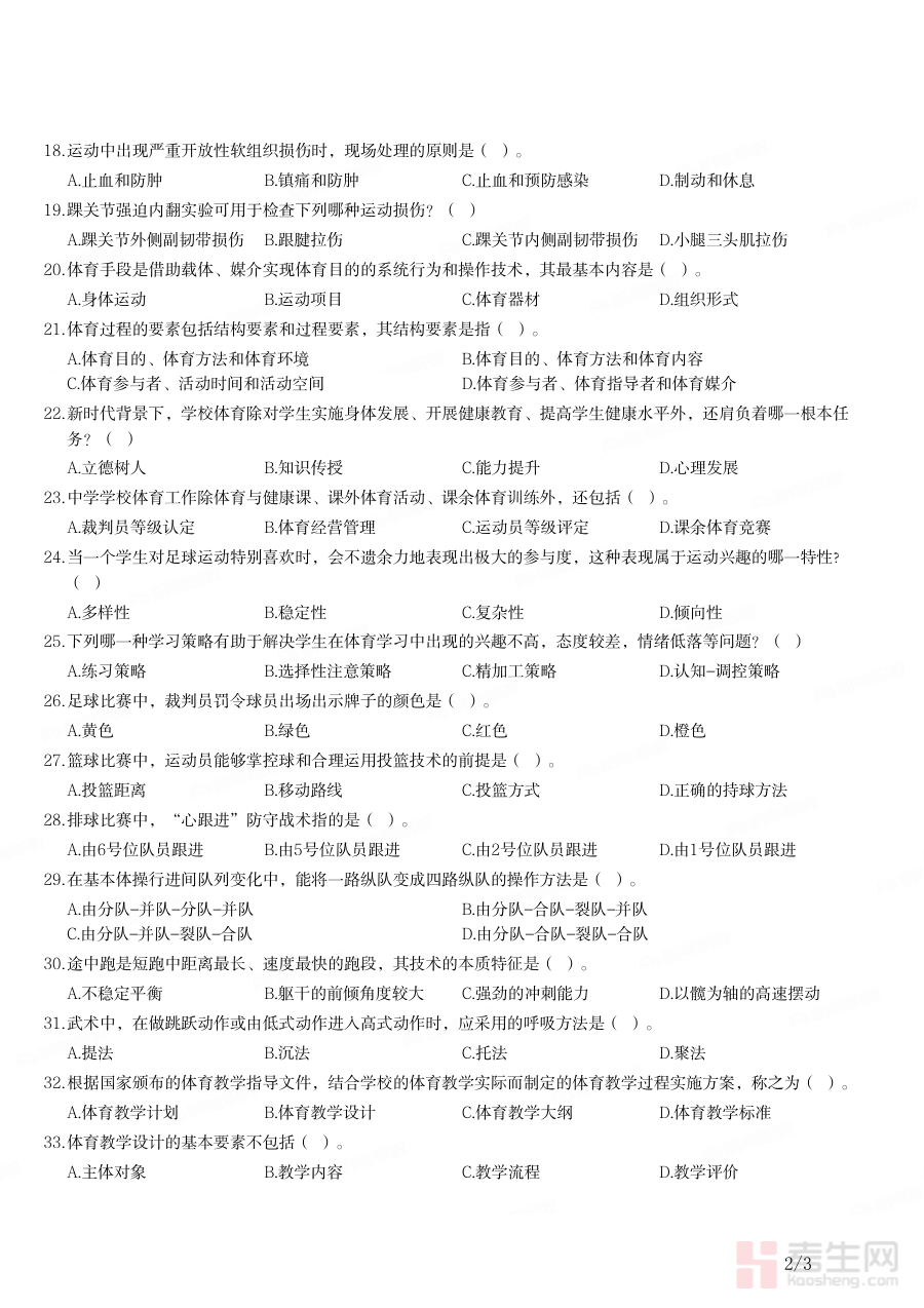 该资料可用于考生备考过程中的阶段检测环节,通过练习帮助考生了解自身对初中体育与健康学科专业知识、教学技能等核心内容的掌握程度;同时也能辅助考生进行学情诊断,明确备考中的优势与不足,从而优化备考规划,使复习更具针对性和效率;此外,还可帮助考生熟悉考试的答题节奏与规范,提升应试适应能力。