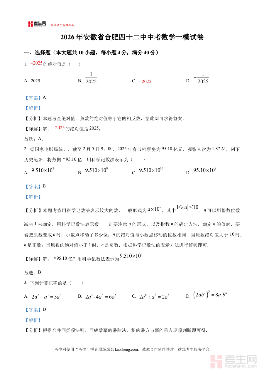 《精品解析:安徽省合肥市四十二中学2025-2026学年上学期九年级数学一模试卷(解析版)》是针对安徽省合肥市四十二中学特定学年学期的九年级数学学科第一次模拟考试所编制的精品解析类备考资料,其精准对应2025-2026学年上学期的教学进度与九年级数学学科的阶段学习要求,为相关师生提供了与本校考试体系高度匹配的学习资源支持,帮助使用者快速对接本校的考试方向与评价标准。