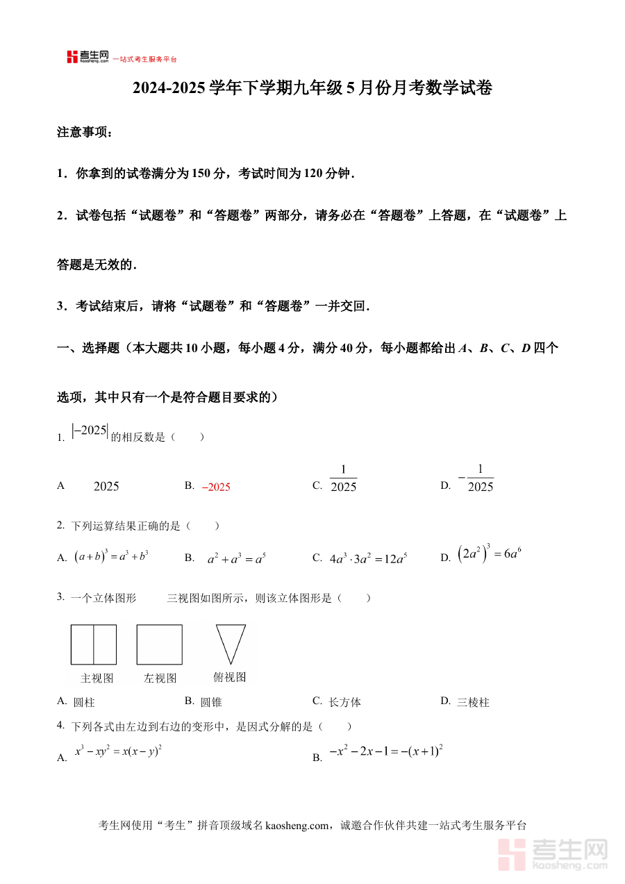 该原卷版资料可作为九年级数学教学过程中的阶段性学情诊断工具,帮助教师准确把握学生在学期中后段的知识掌握状况和能力发展水平,为后续教学内容的调整和备考计划的制定提供数据支撑;同时也能让学生通过模拟真实考试的方式,熟悉月考的考查流程和整体框架,及时发现自身在数学学习中的薄弱环节,从而开展更具针对性的复习和巩固工作。